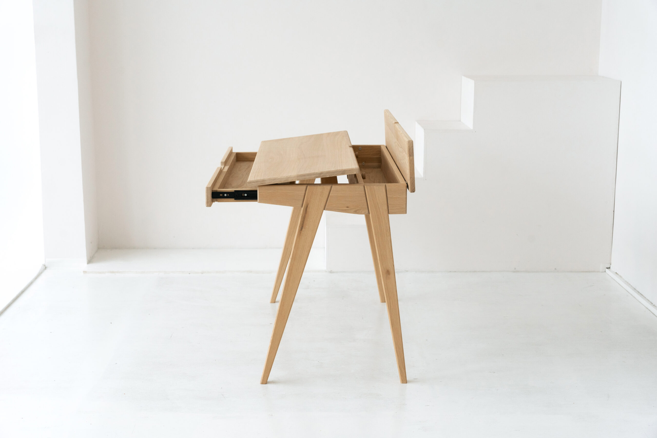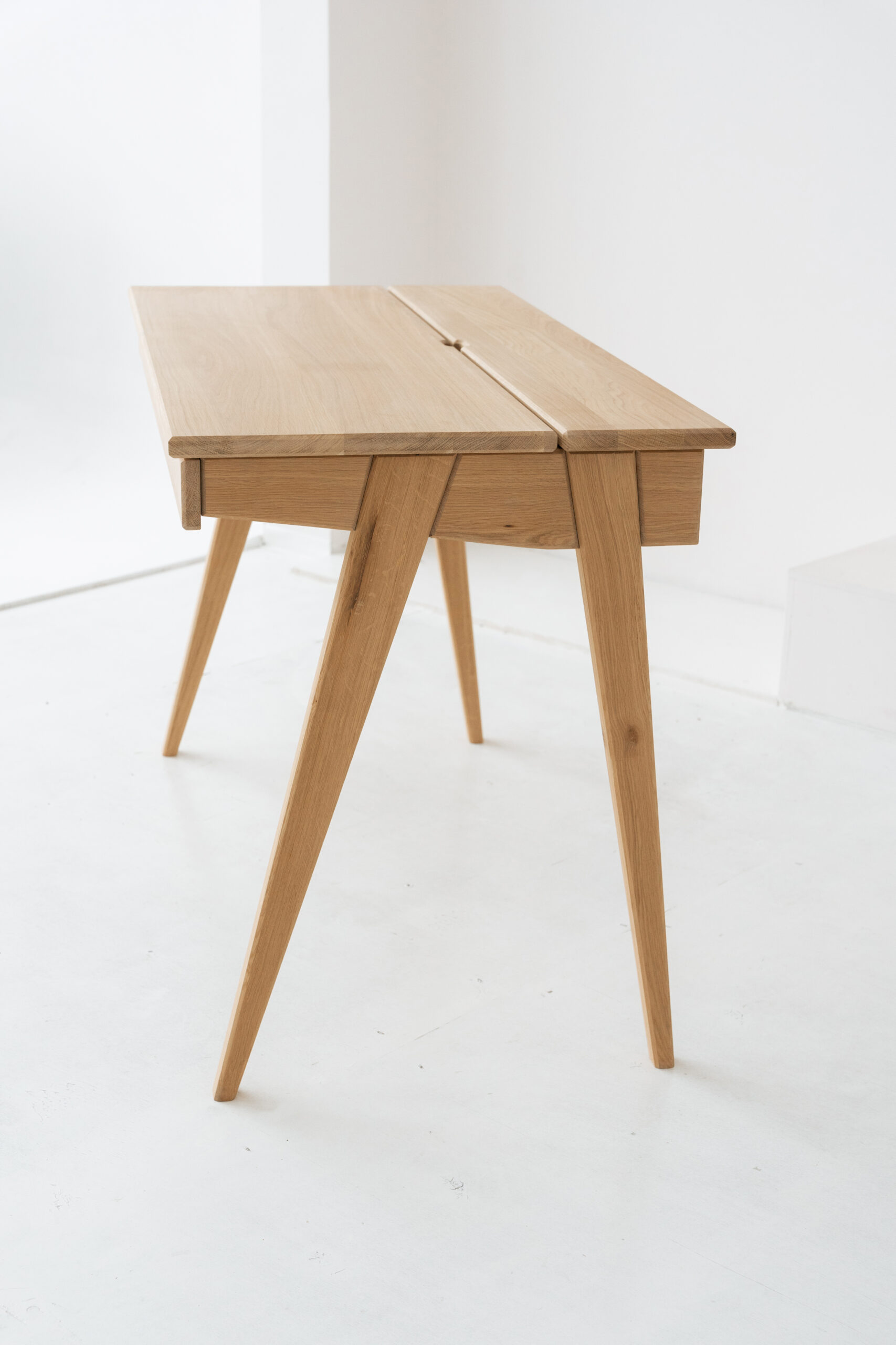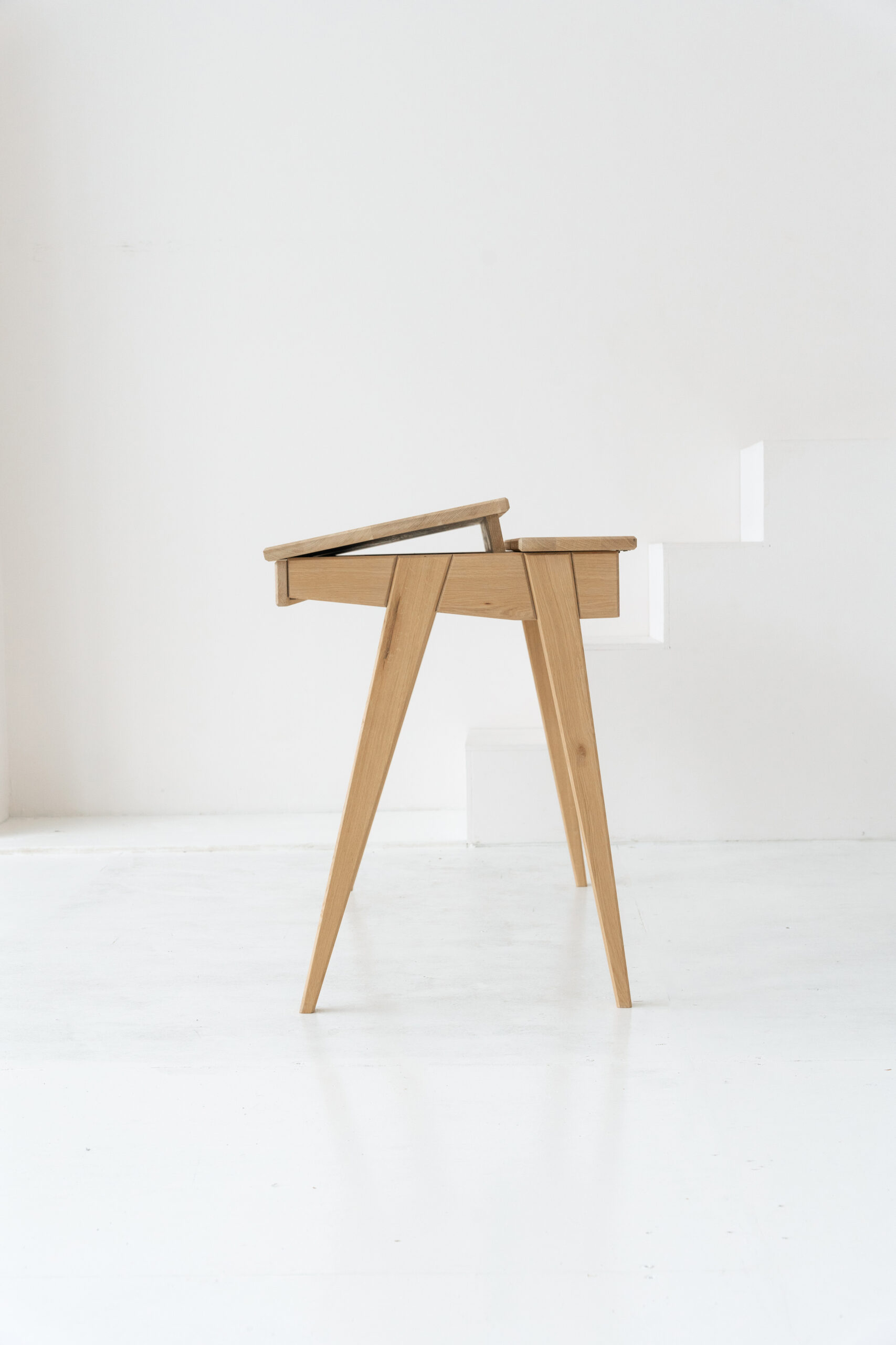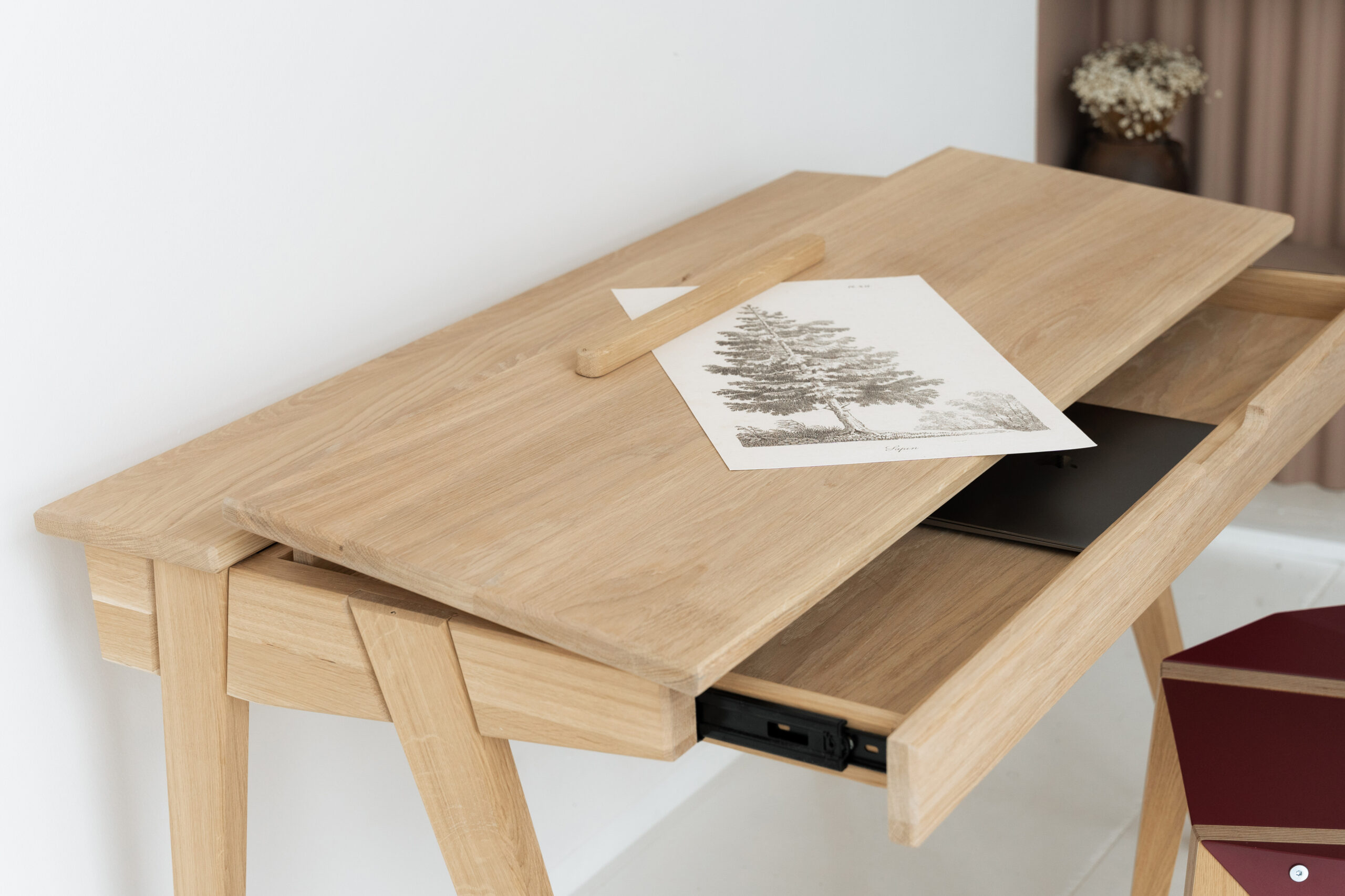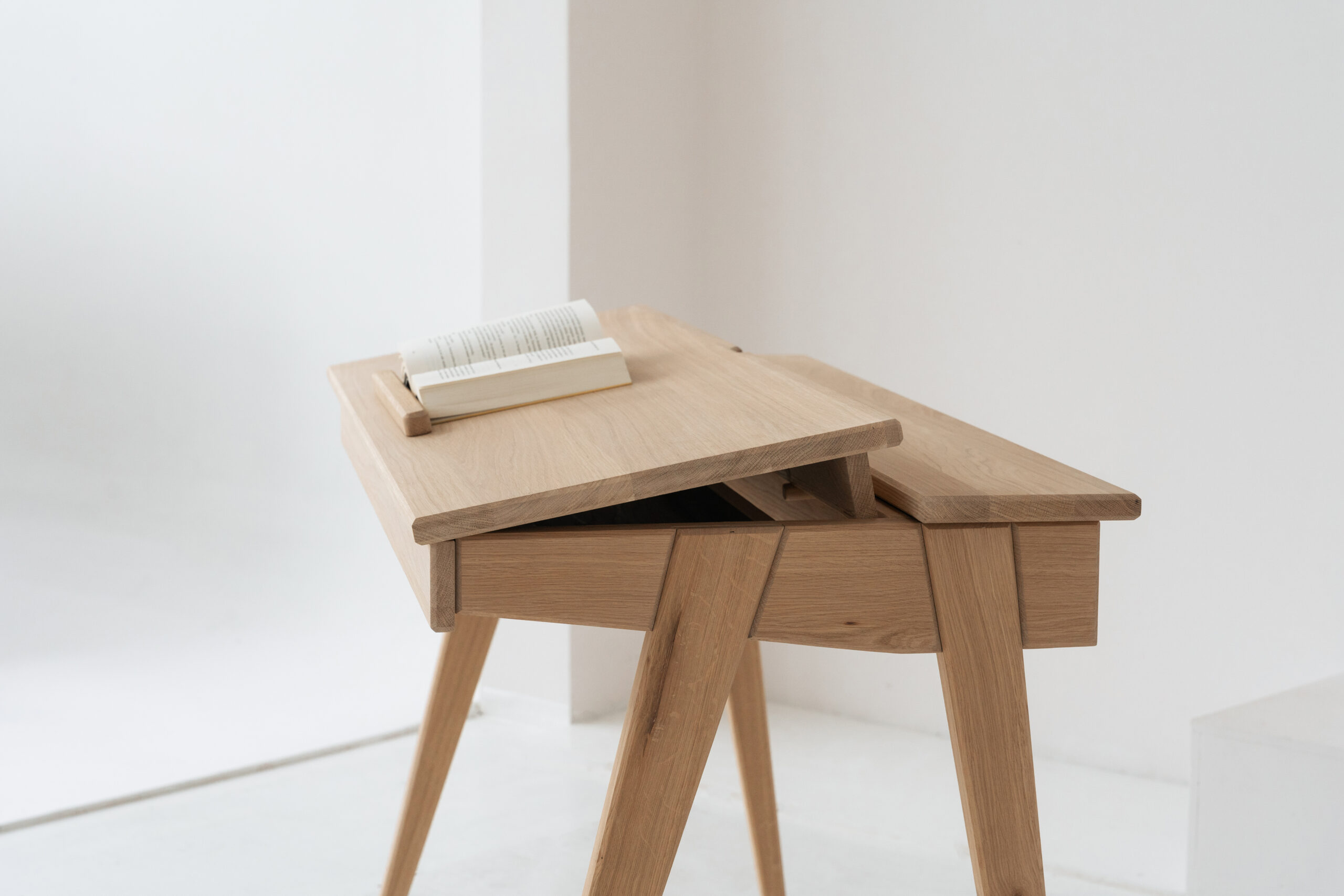 Dębowe biurko Archi z pochylanym blatem i schowkiem na kable.