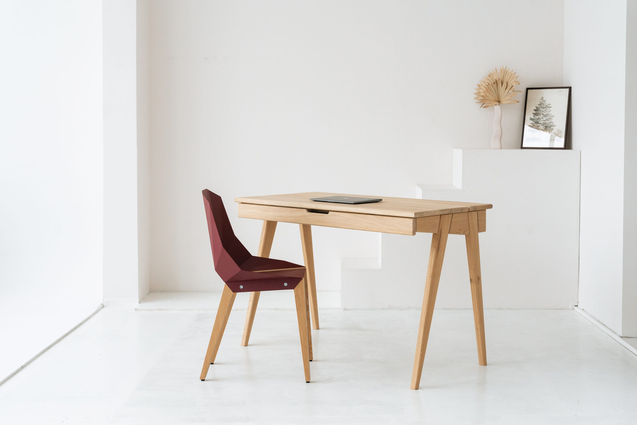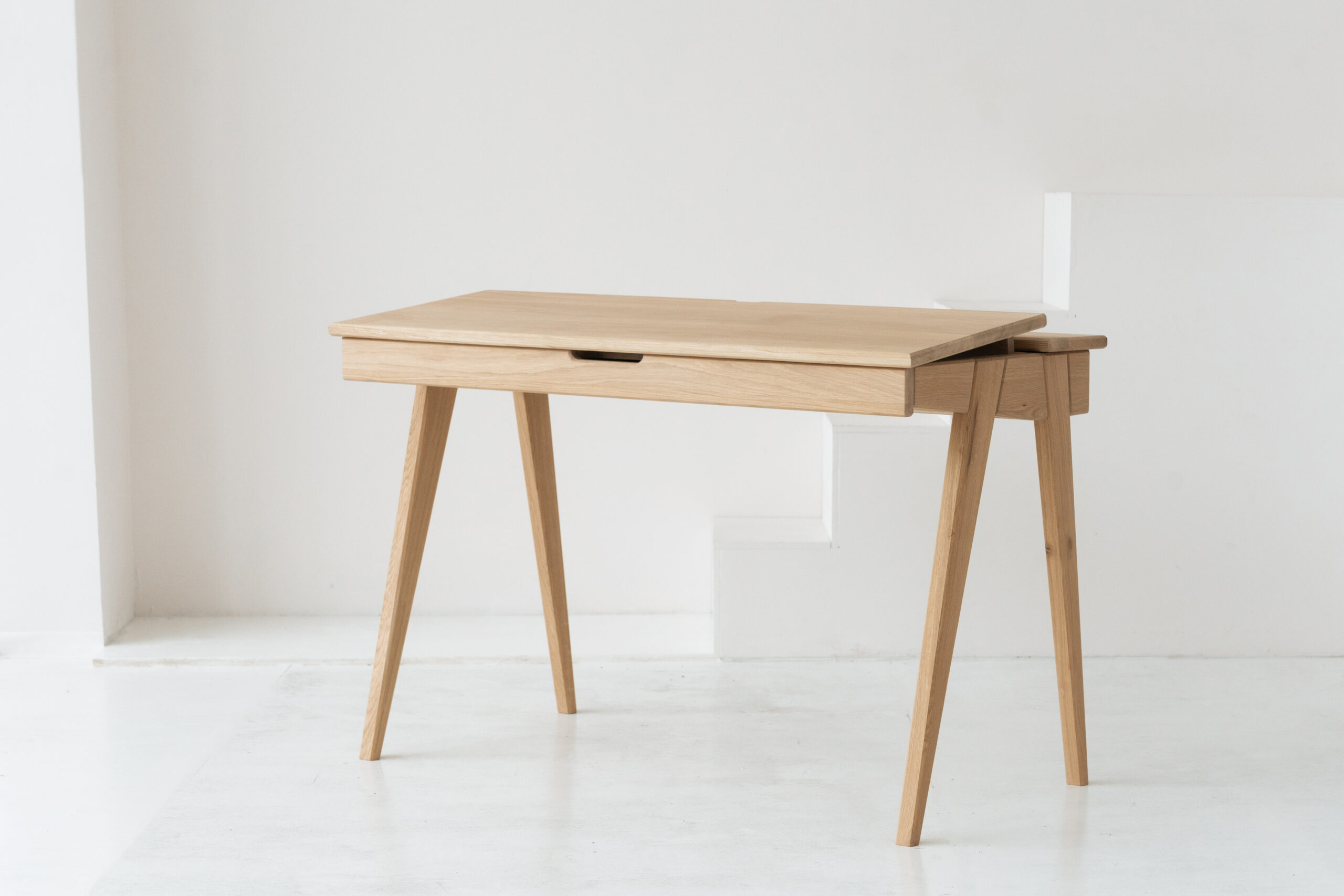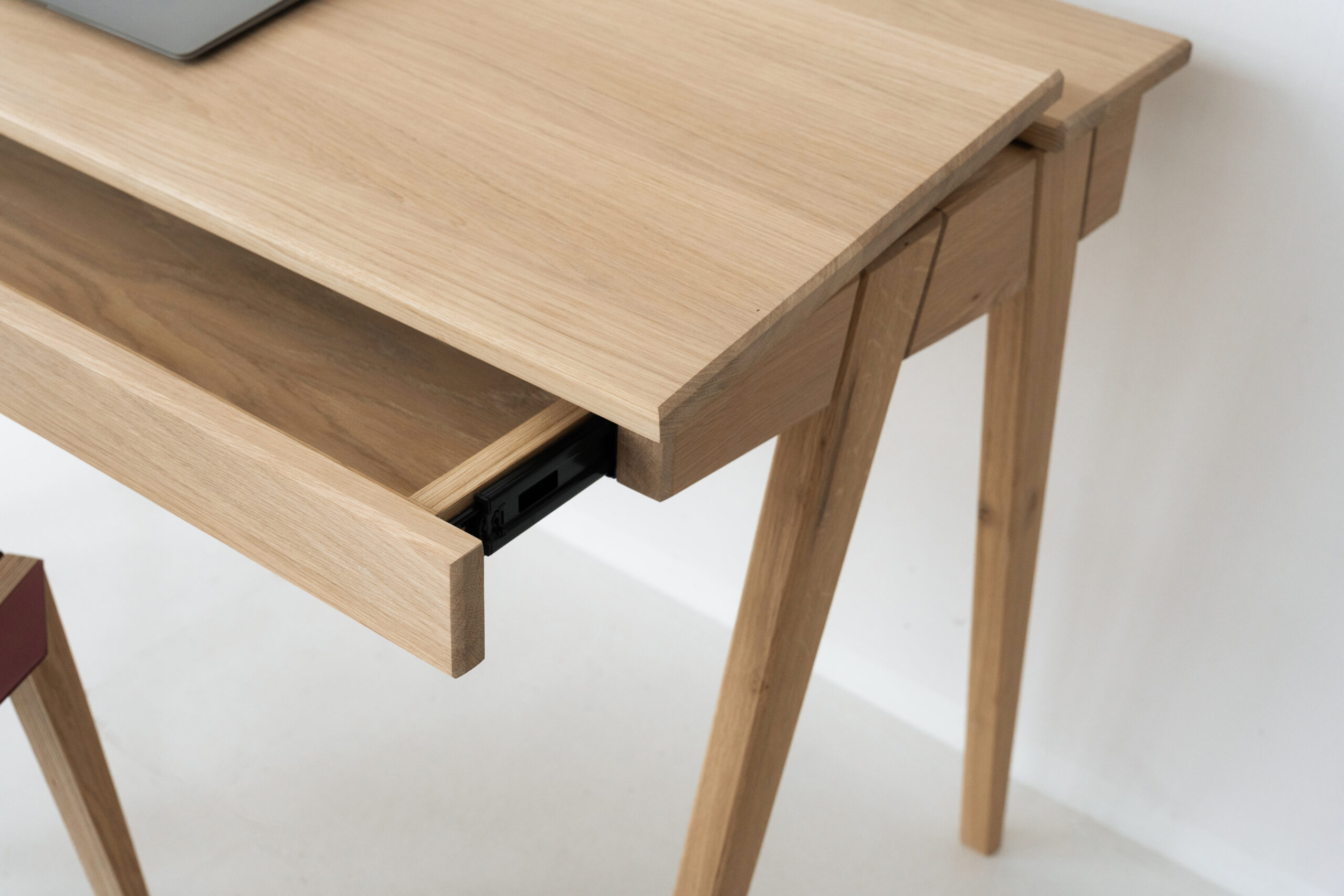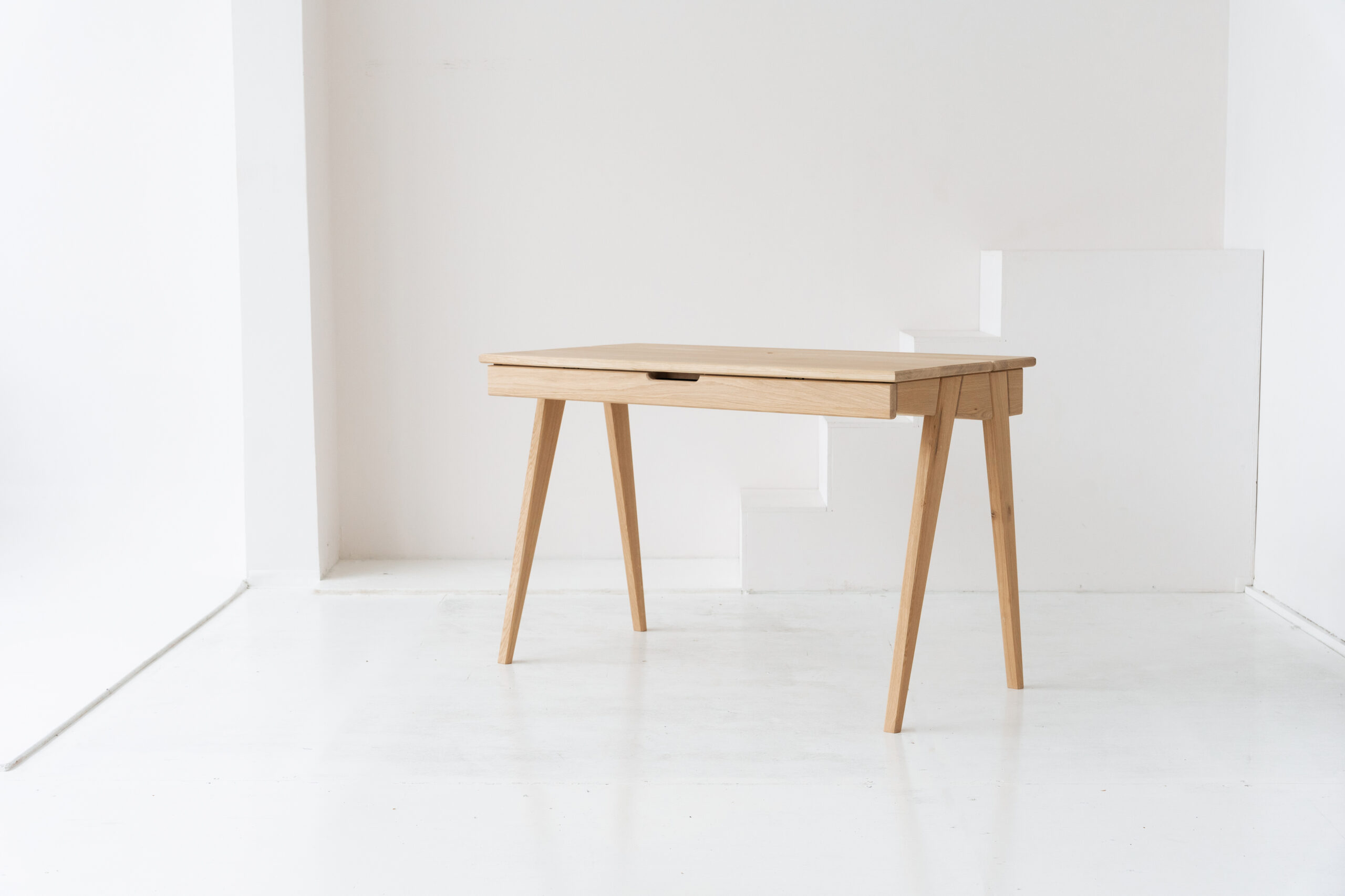 Dębowe biurko Archi z pochylanym blatem i schowkiem na kable.