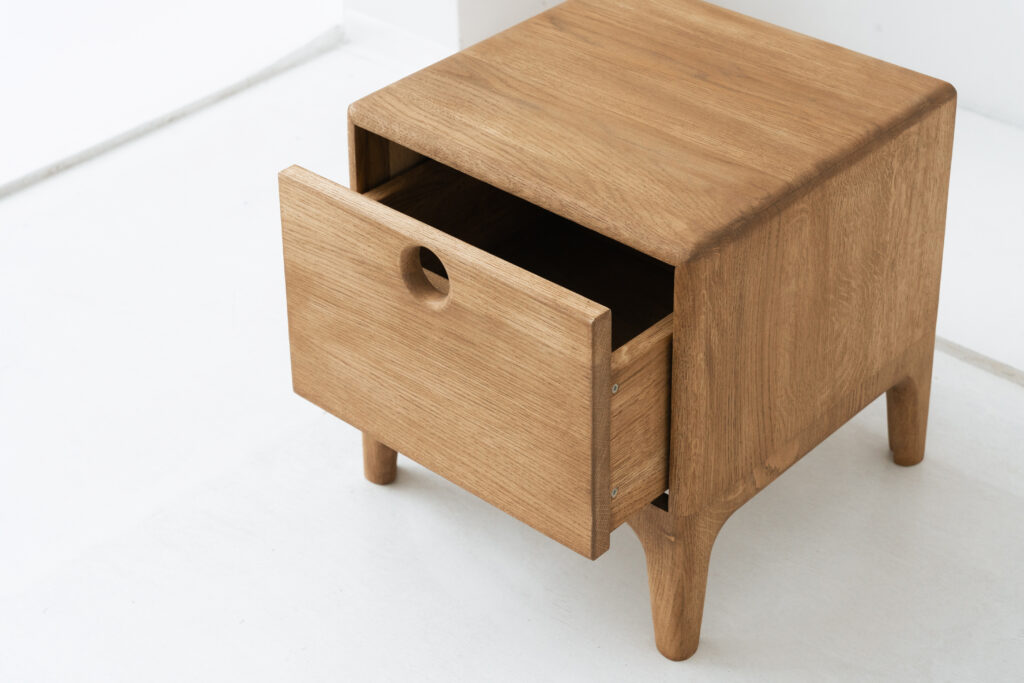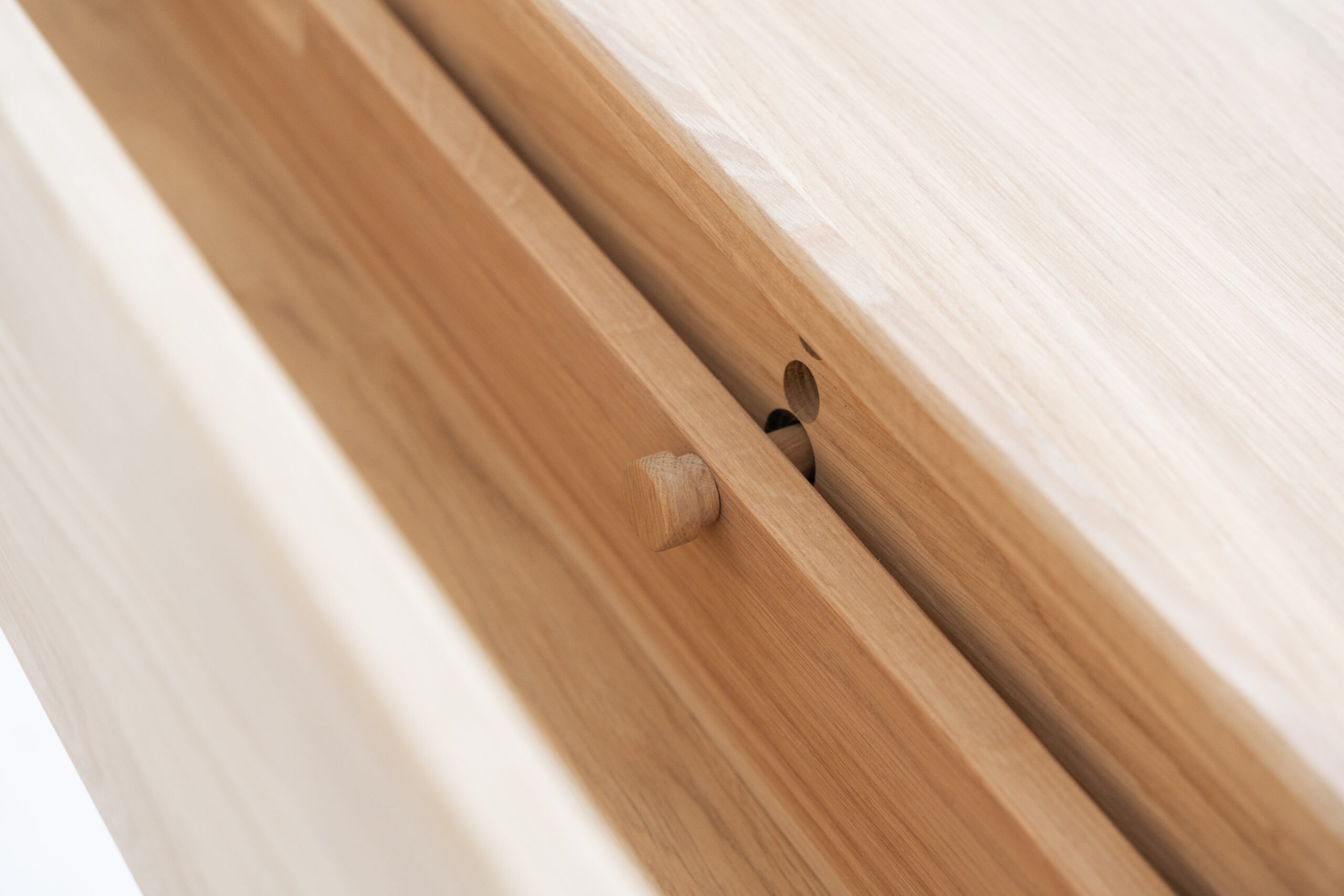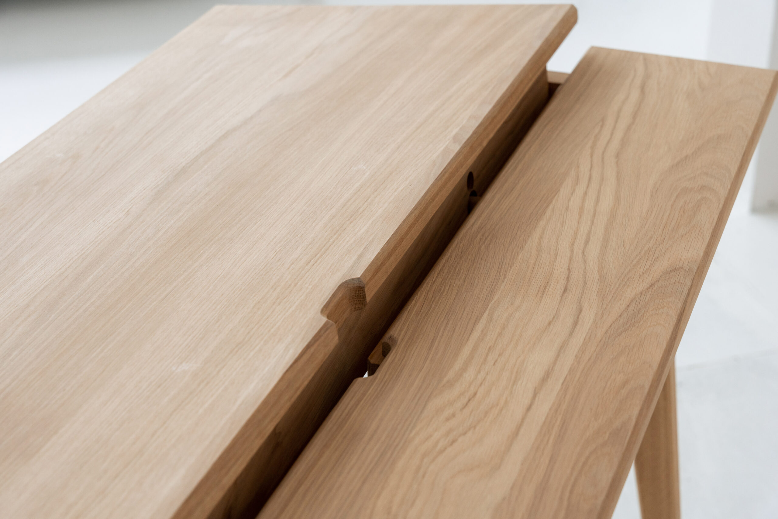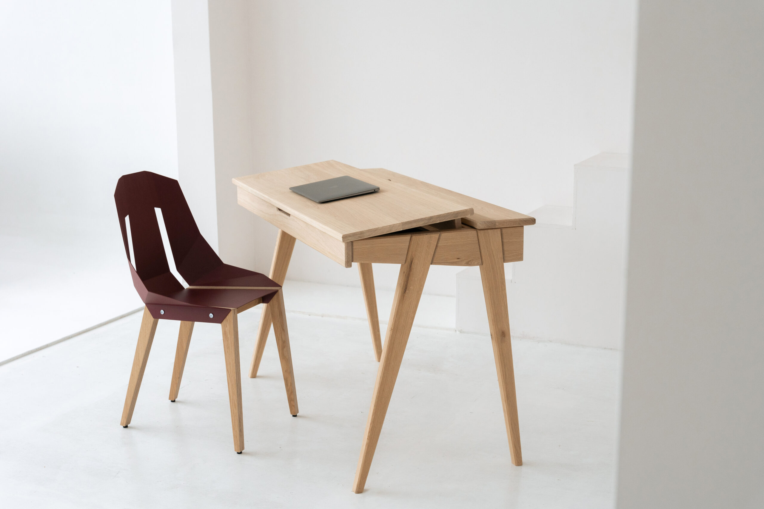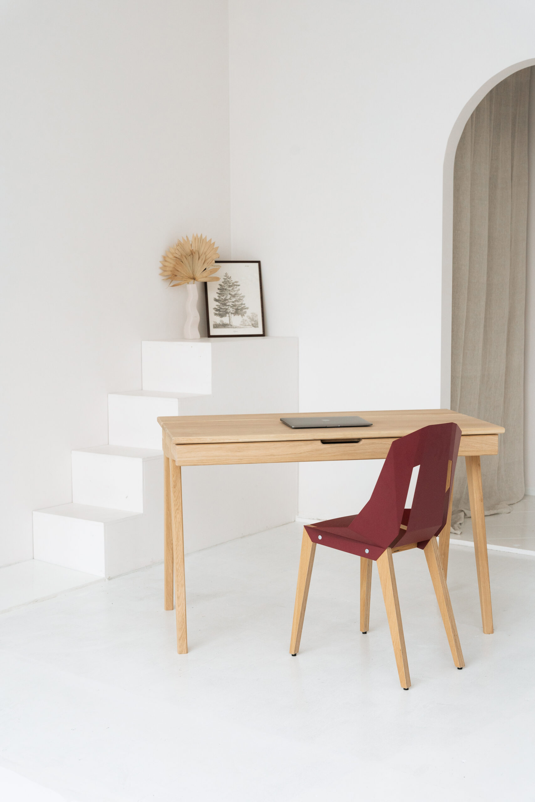 Dębowe biurko Archi z pochylanym blatem i schowkiem na kable.