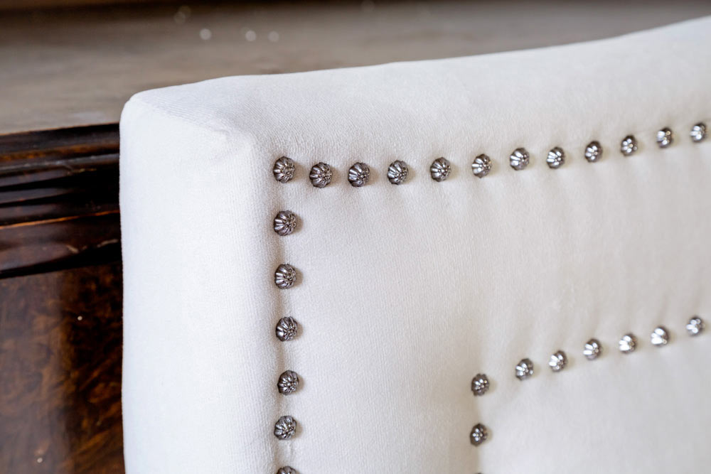 Najbardziej charakterystycznym elementem jest zagłówek ozdobiony dekoracyjnymi guzikami oraz nitami, które biegną wzdłuż jego ramy i nadają całości wyrazistego charakteru.