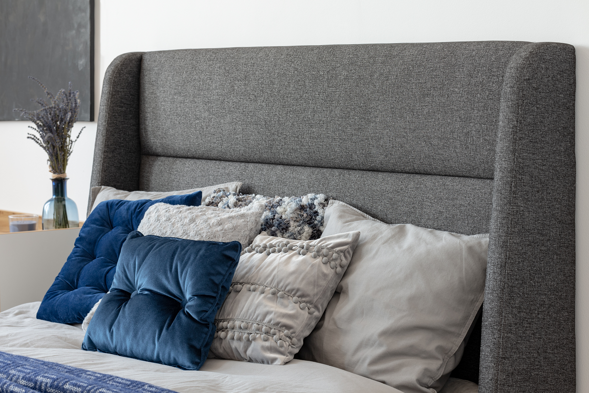 Charakterystycznym elementem są zagłówek z bocznymi oparciami (tzw. uszami), które tworzą formę delikatnie otulającą przestrzeń snu.