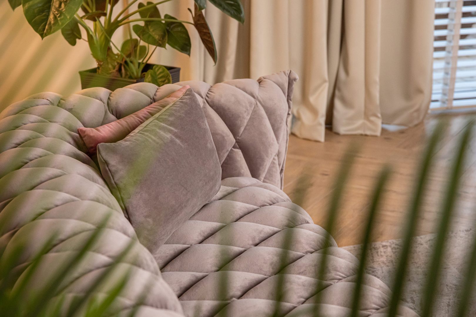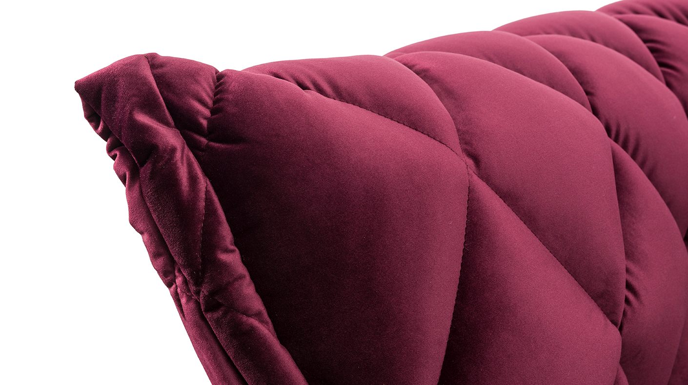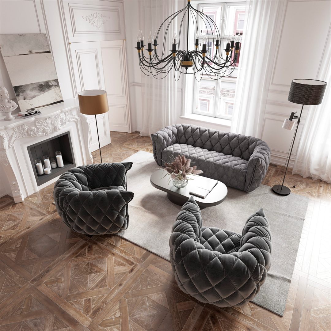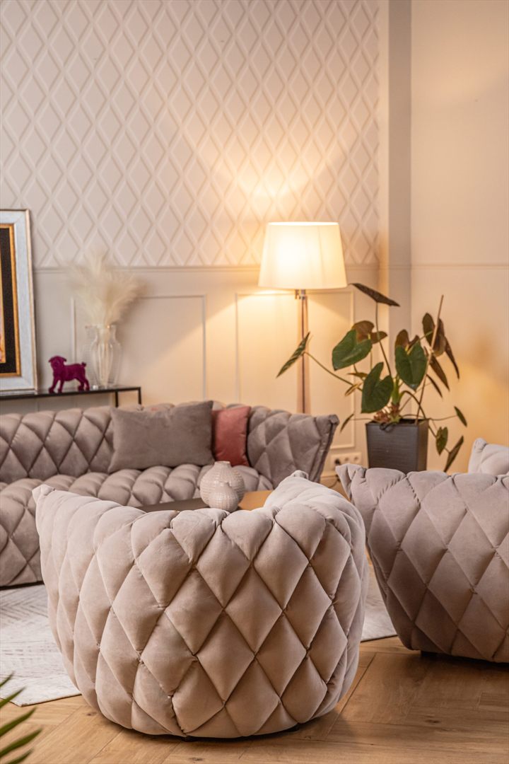 Jego unikalny wygląd, z eleganckimi przeszyciami w kształcie rombów oraz podłokietnikami wykończonymi grubą zakładką, sprawia, że staje się on prawdziwym dziełem sztuki, które z łatwością wprowadzi szyk i elegancję do każdego wnętrza.
