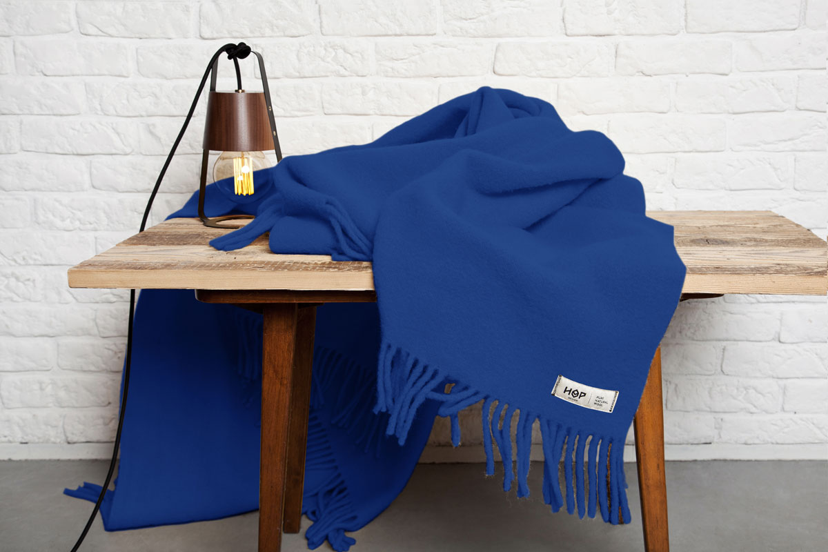 Kobaltowy koc YETI z wełny owczej, 145 x 205 cm, elegancka i naturalne ciepło.