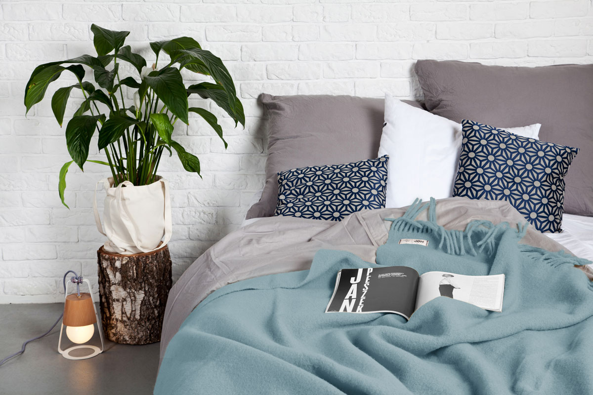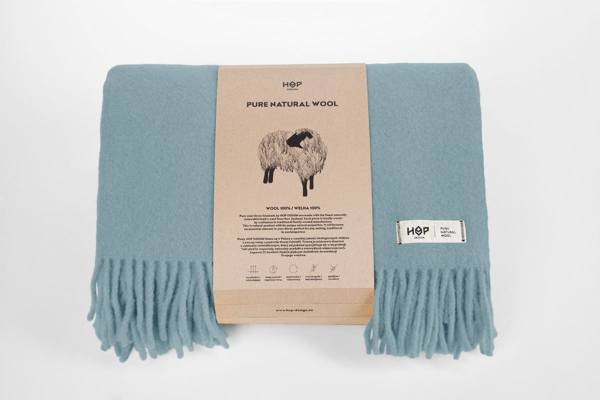 Pastelowy błękitny koc YETI z wełny owczej, subtelny, ciepły i miękki.