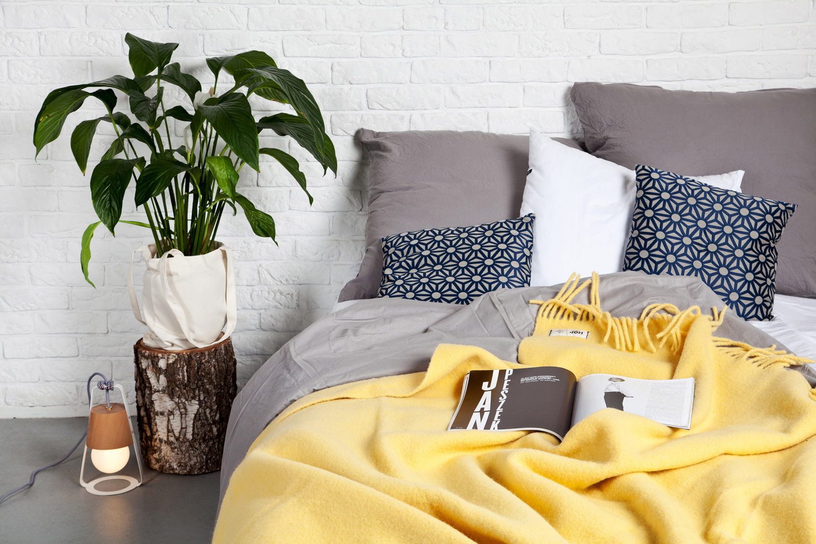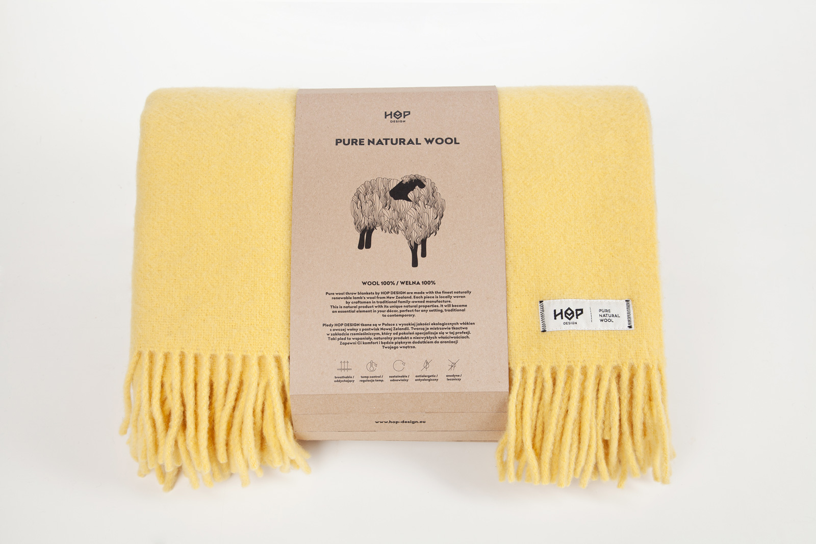 Pastelowy żółty koc YETI z wełny owczej, 145 x 205 cm, ciepła radość i komfort.