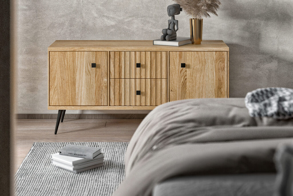 Komoda dębowa BALI LIFT 120 cm to funkcjonalny i estetyczny mebel o wyważonych proporcjach, wykonany w całości z litego drewna dębowego. Jej elegancka forma została podkreślona przez zwężane boki oraz naturalną fakturę drewna, zabezpieczoną olejem o matowym wykończeniu. Ciepły odcień dębu doskonale komponuje się z wnętrzami urządzonymi w stylu skandynawskim, loftowym i nowoczesnym.