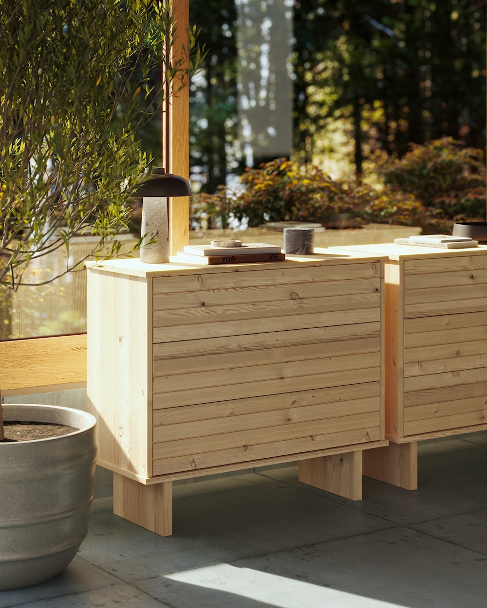 Zajmuje niewiele miejsca, ale pomieści naprawdę dużo. Możesz ustawić ją w dowolnym pomieszczeniu, bo trzy szuflady zapewnią wystarczającą przestrzeń na wszystkie niezbędne rzeczy. Dzięki zintegrowanej funkcji “push to open” komoda ma czysty, prosty wygląd, bez uchwytów czy gałek. Cienkie, wsunięte nóżki sprawiają, że z przodu wygląda, jakby unosiła się nad podłogą, a z boku ma bardziej kompaktowy, pudełkowy kształt. Frezowanie w szufladach dodaje wrażenia poziomych, bezszwowych listew.