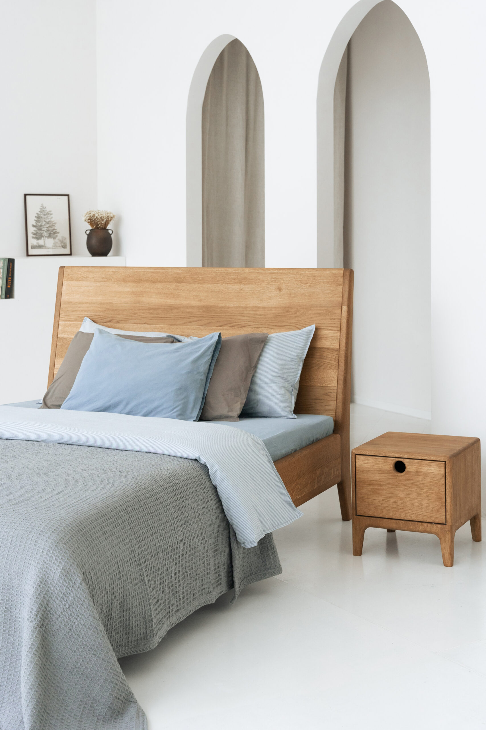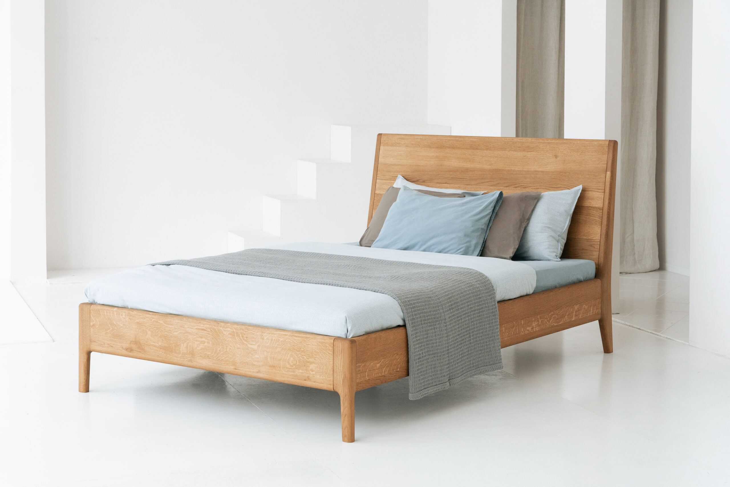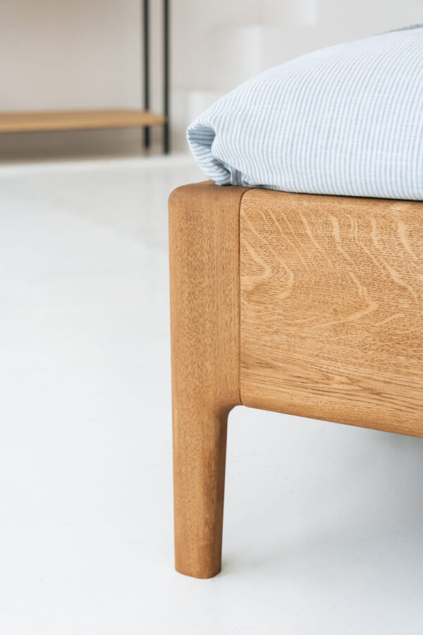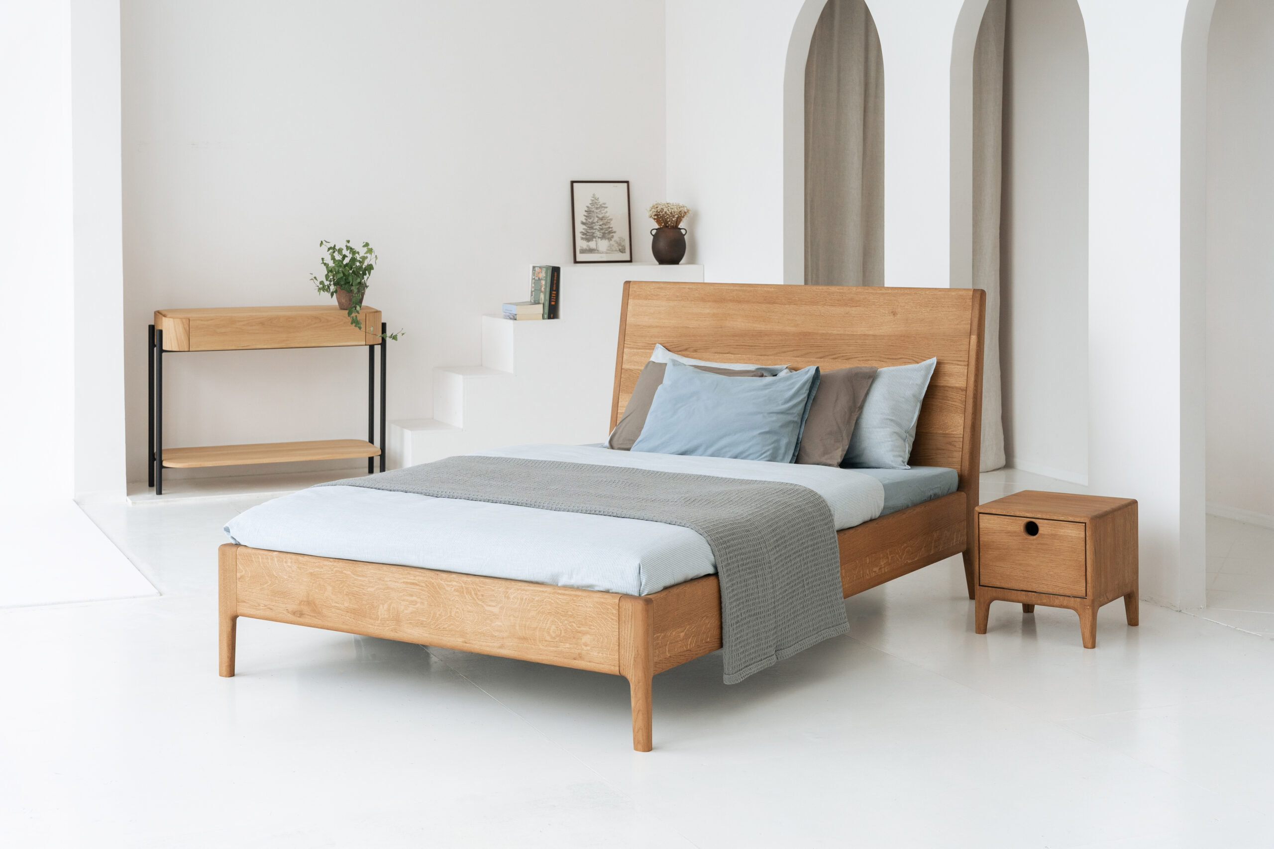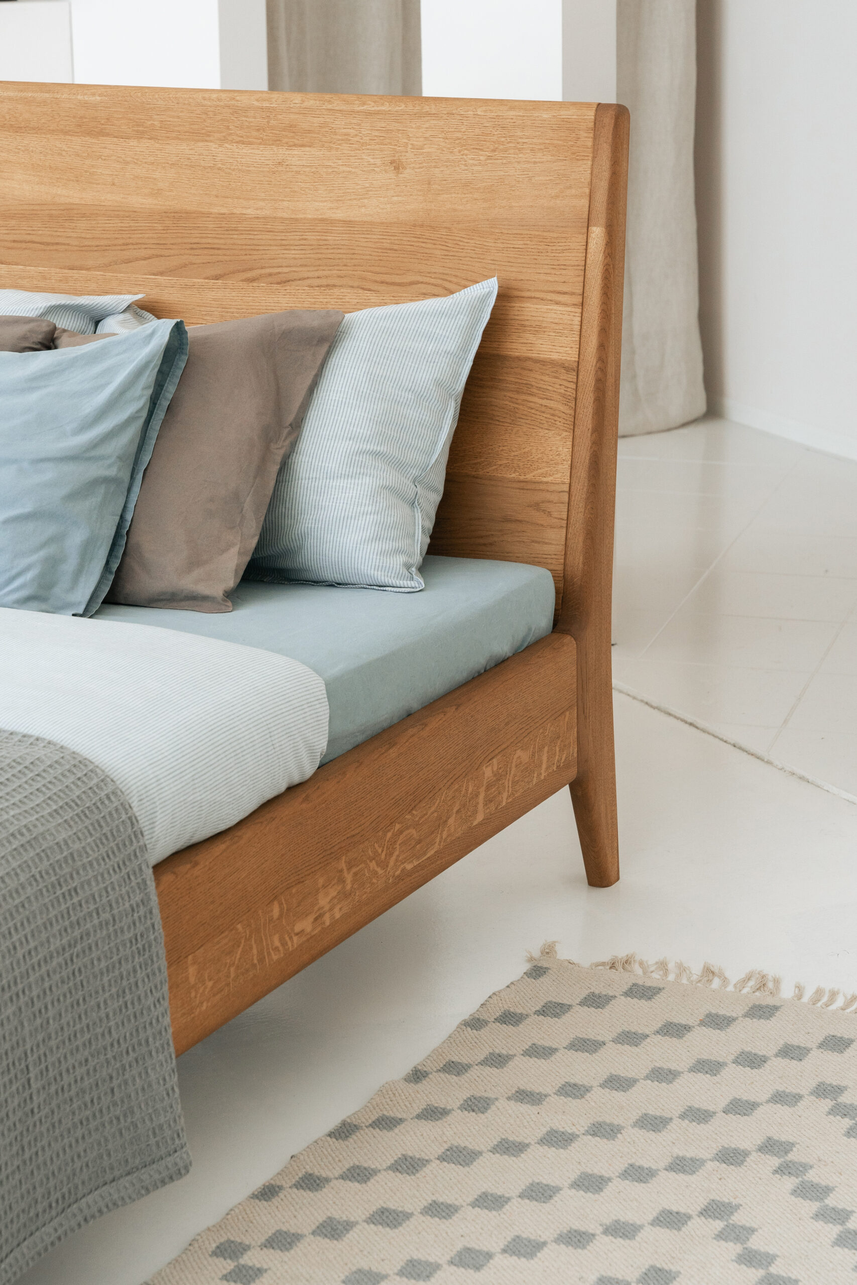 Dębowe łóżko Este z pochylonym zagłówkiem i opcją kontenera.