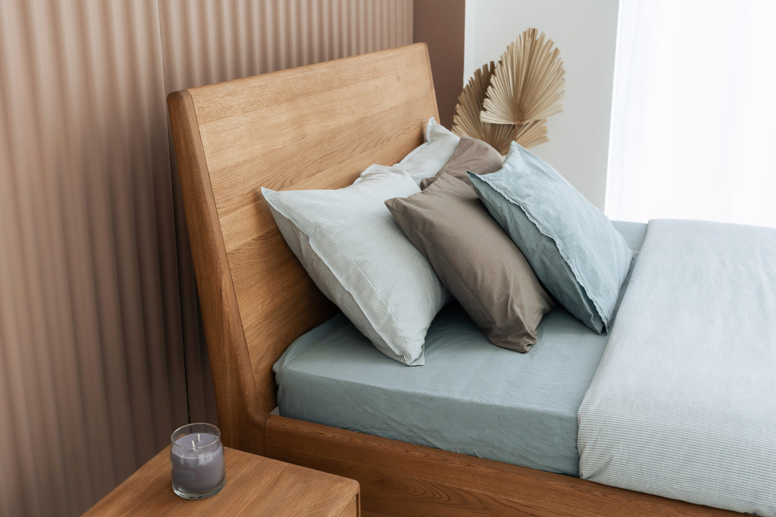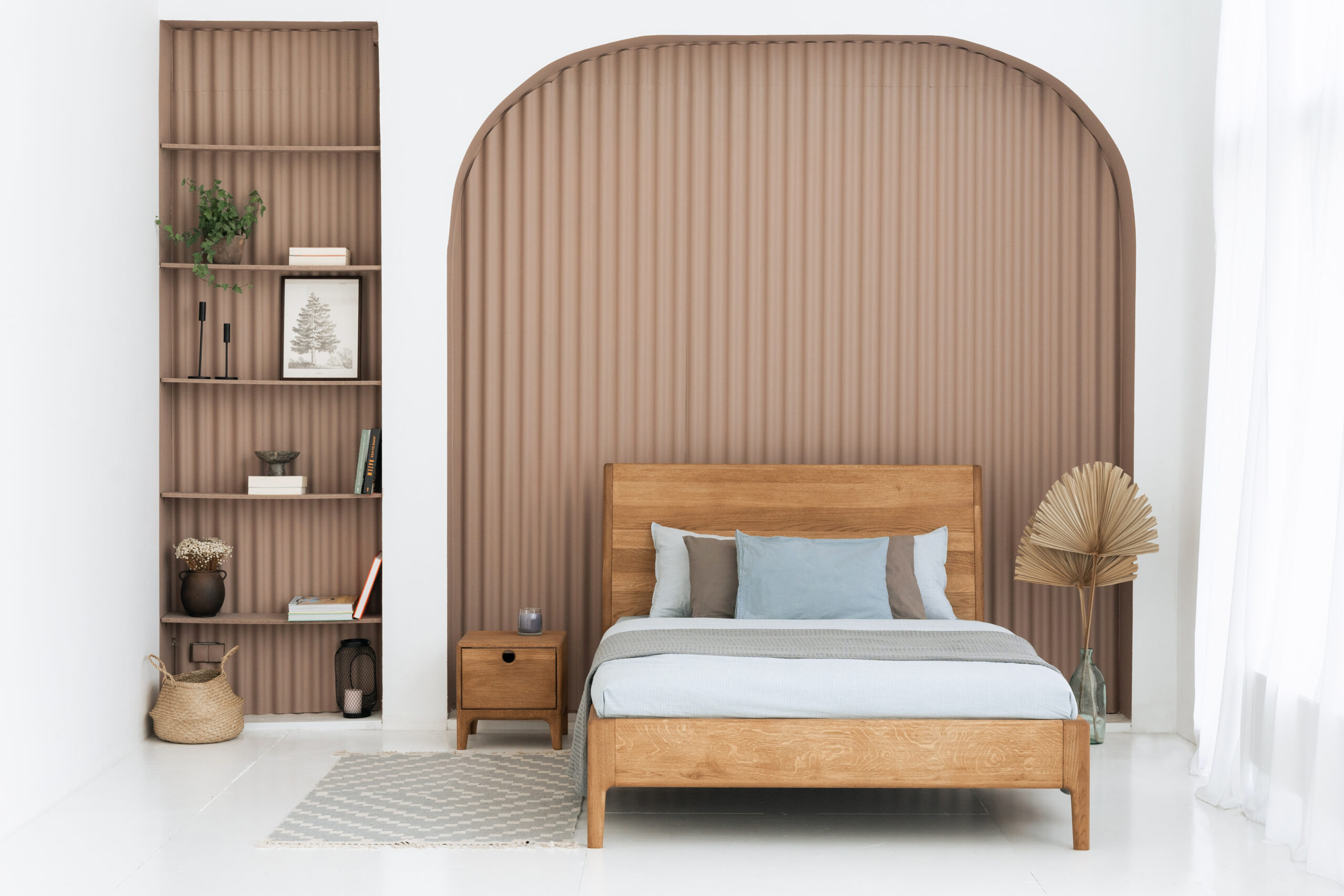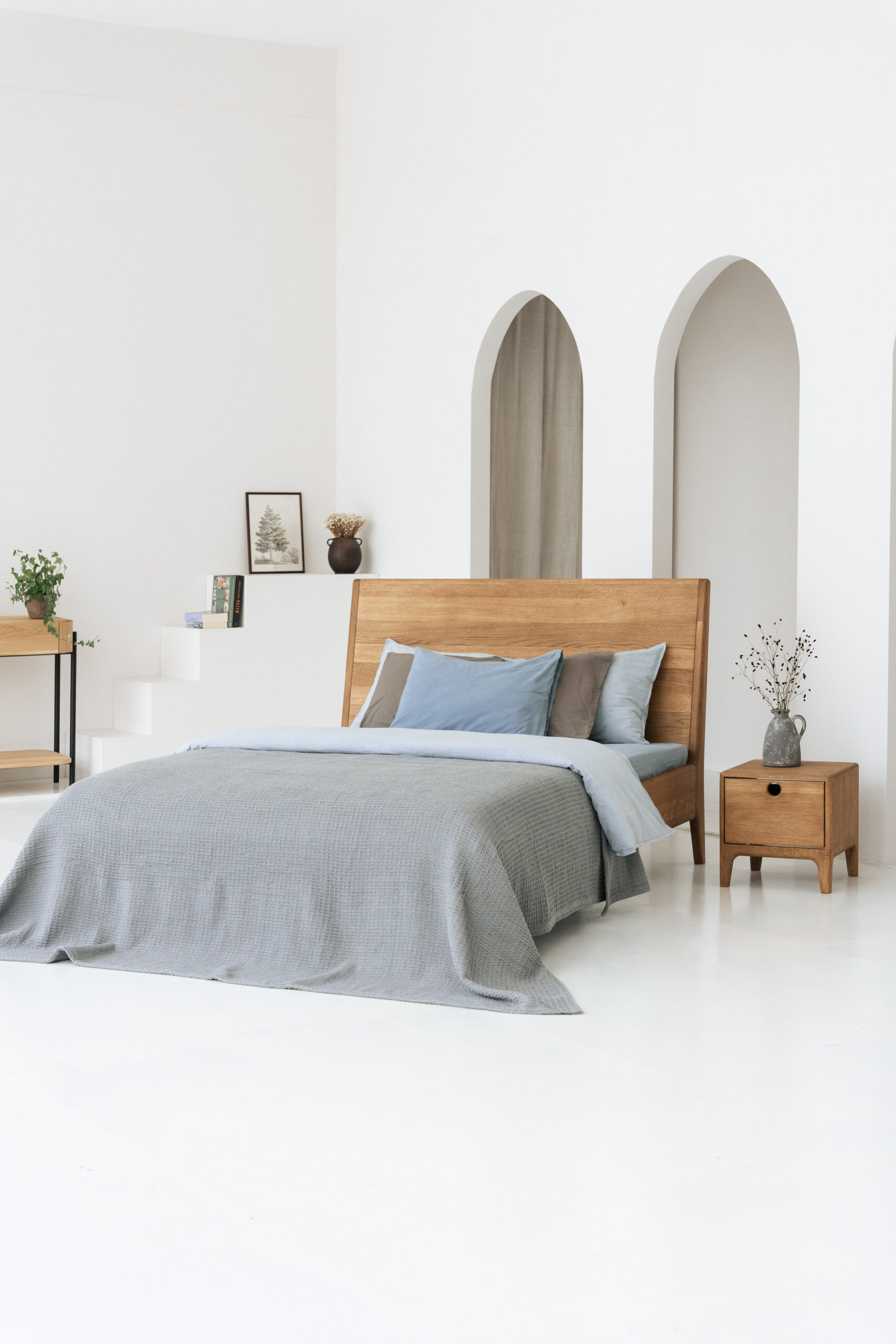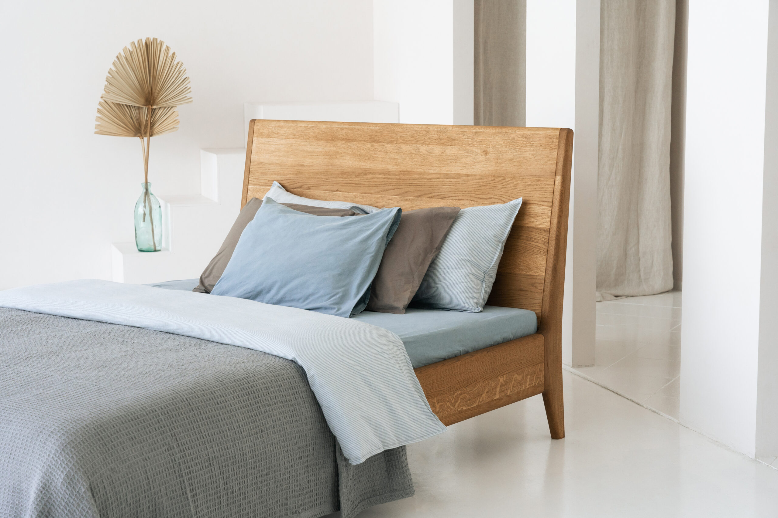 Dębowe łóżko Este z pochylonym zagłówkiem i opcją kontenera.