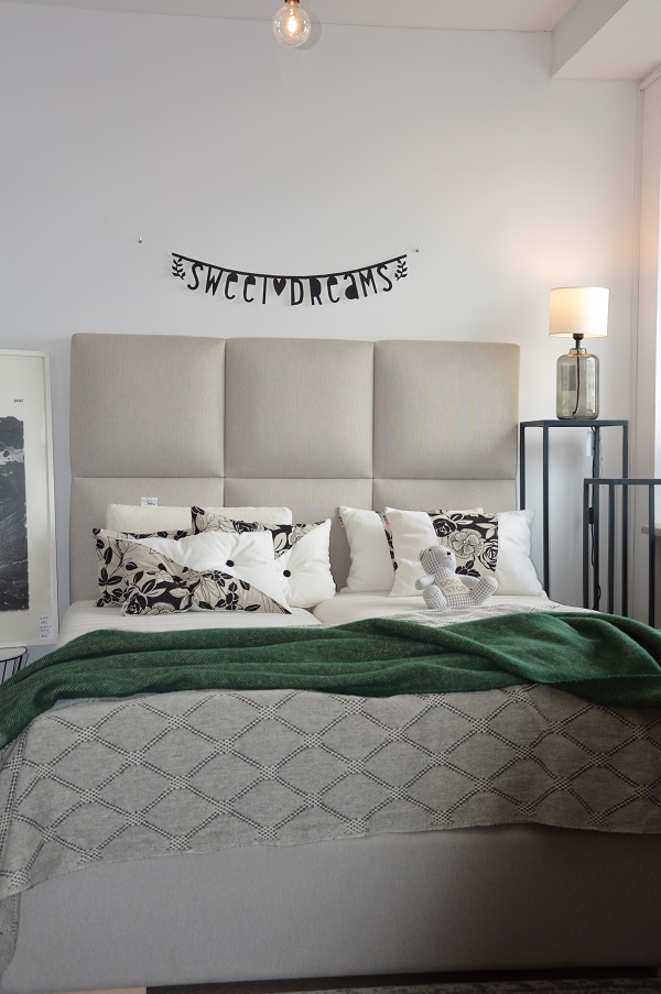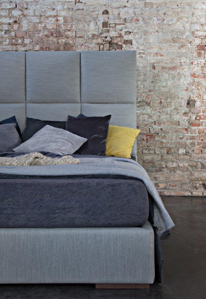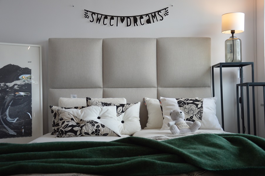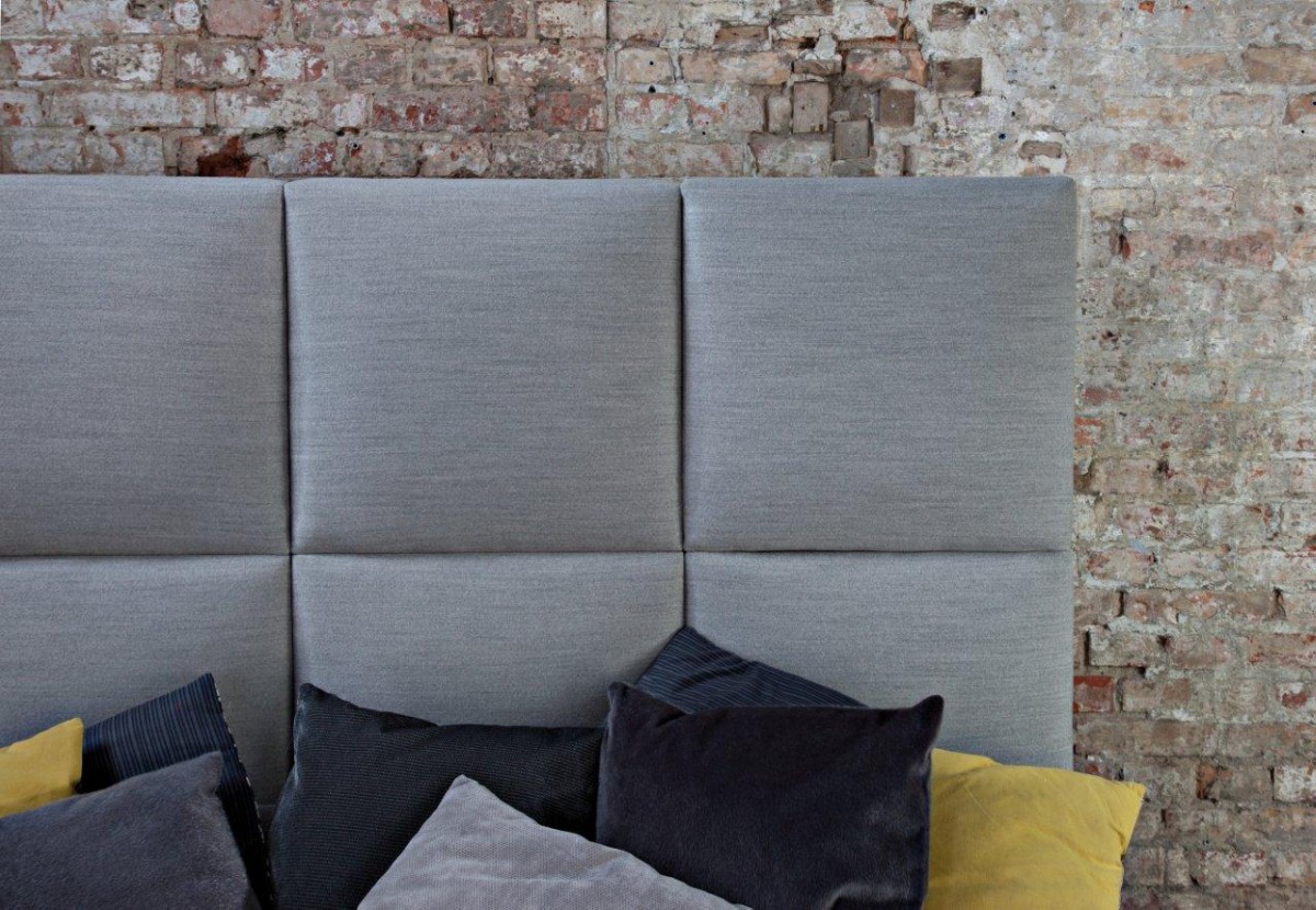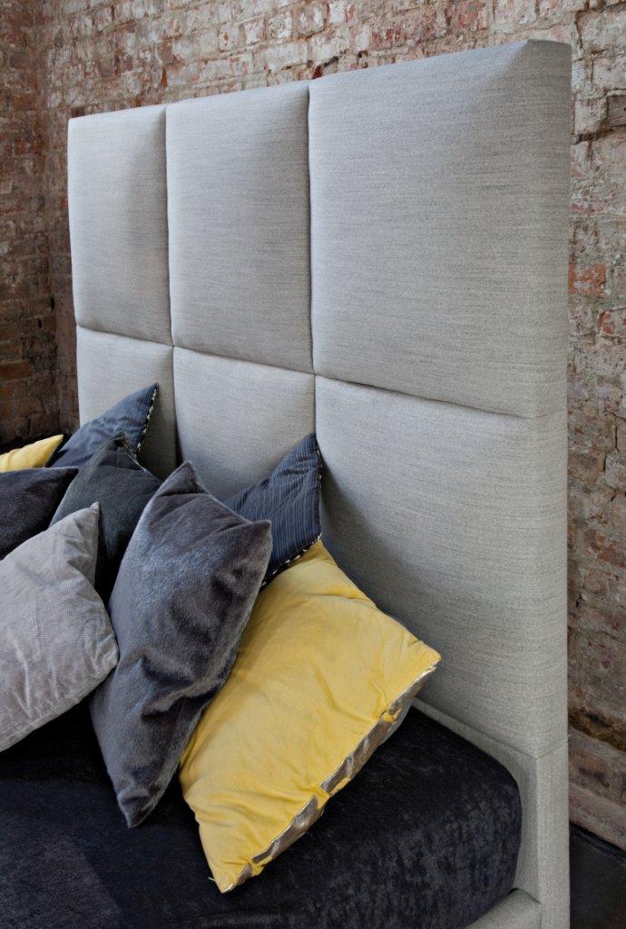 Najbardziej charakterystycznym elementem jest bardzo wysoki zagłówek (150 cm), podzielony na duże, miękkie kwadraty. Taka forma nadaje wnętrzu stylu i sprawia, że łóżko przyciąga uwagę już od wejścia.