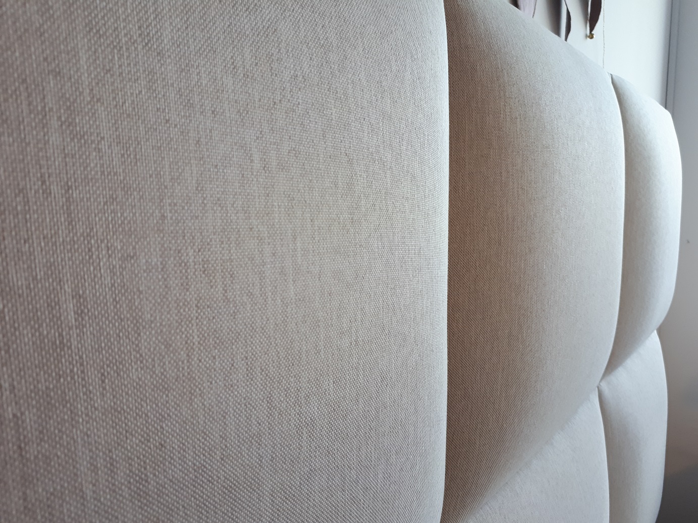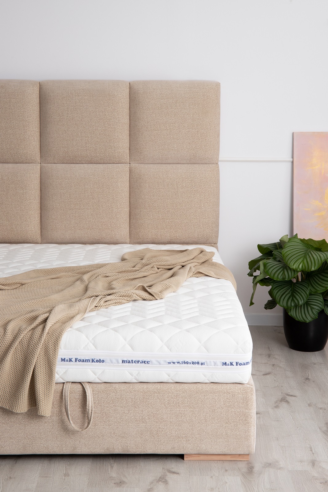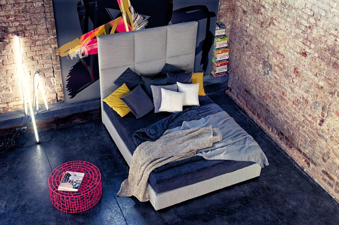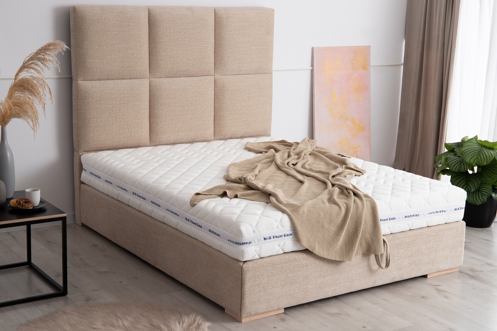 Najbardziej charakterystycznym elementem jest bardzo wysoki zagłówek (150 cm), podzielony na duże, miękkie kwadraty. Taka forma nadaje wnętrzu stylu i sprawia, że łóżko przyciąga uwagę już od wejścia.