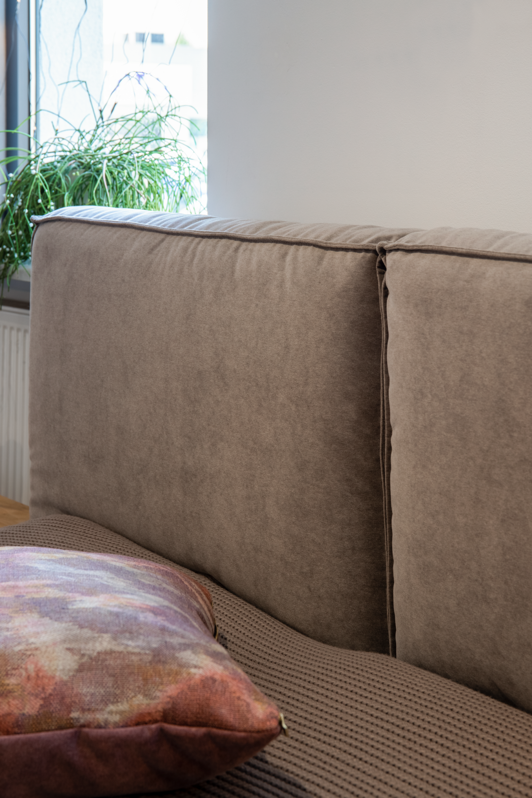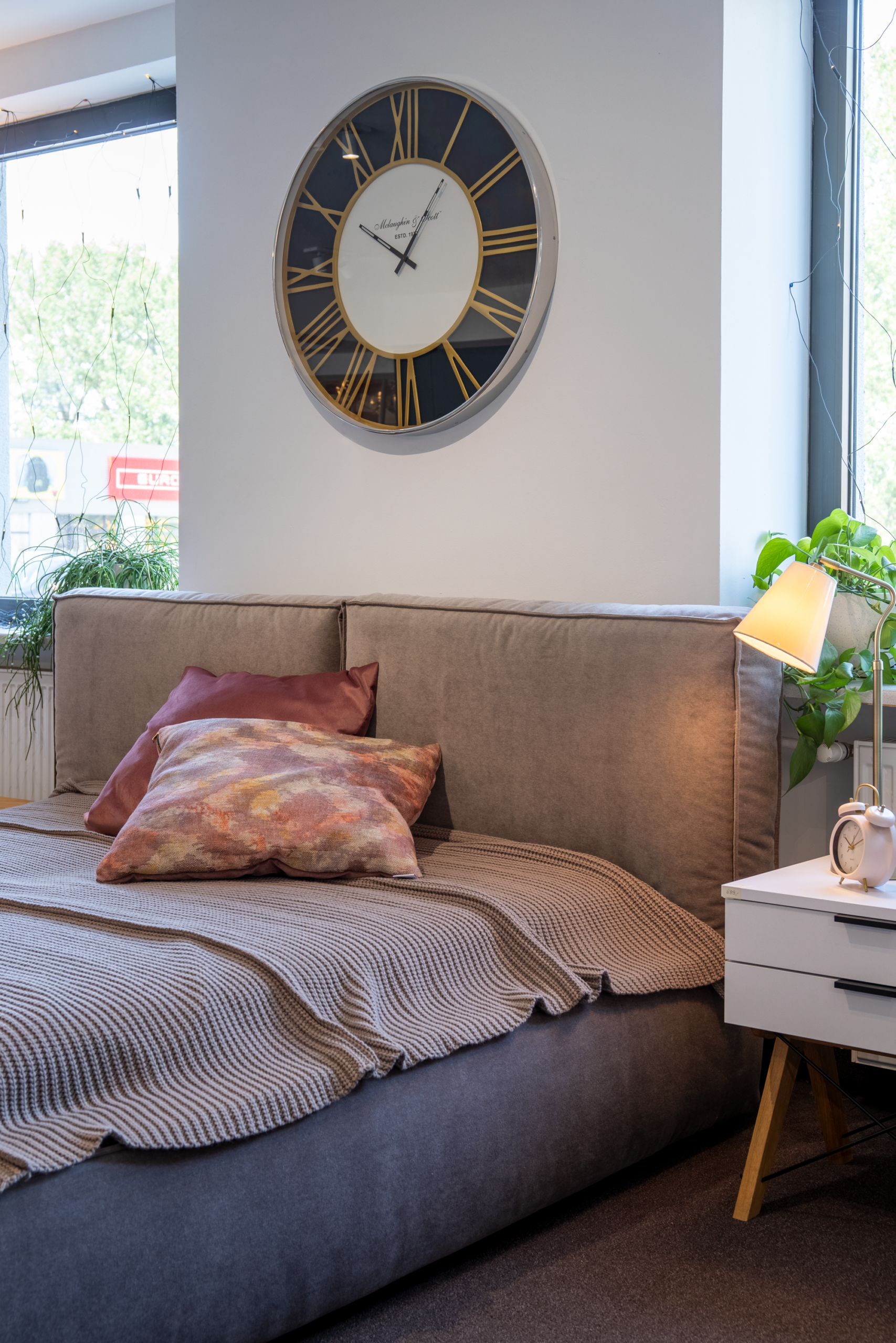 Jego grube, tapicerowane boki oraz dwie duże, miękkie poduchy tworzą wyjątkowo wygodne oparcie i sprawiają, że łóżko aż zachęca do odpoczynku. To model, który łączy funkcjonalność z przyjemnym, domowym charakterem.