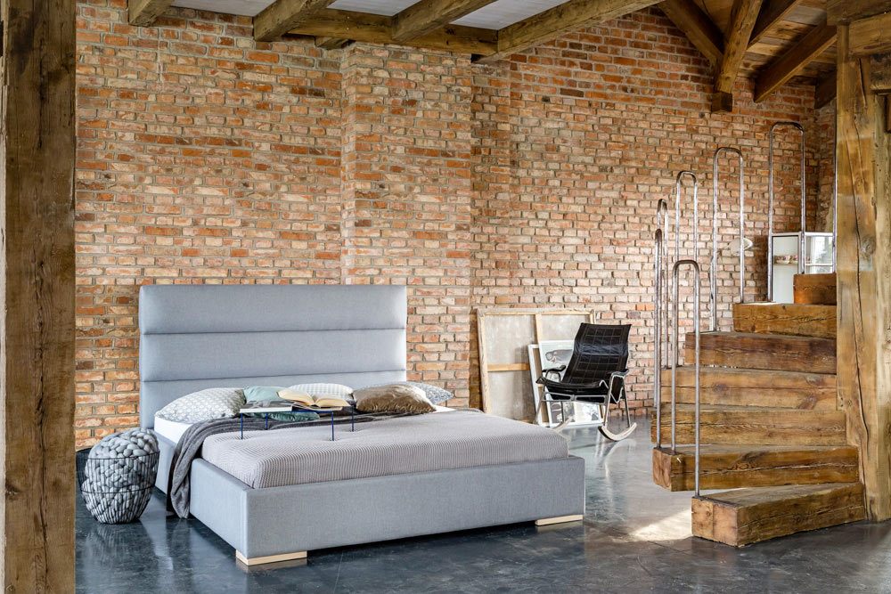 Łóżko TEO z wysokim, graficznym zagłówkiem to dobre uzupełnienie nowoczesnej sypialni.