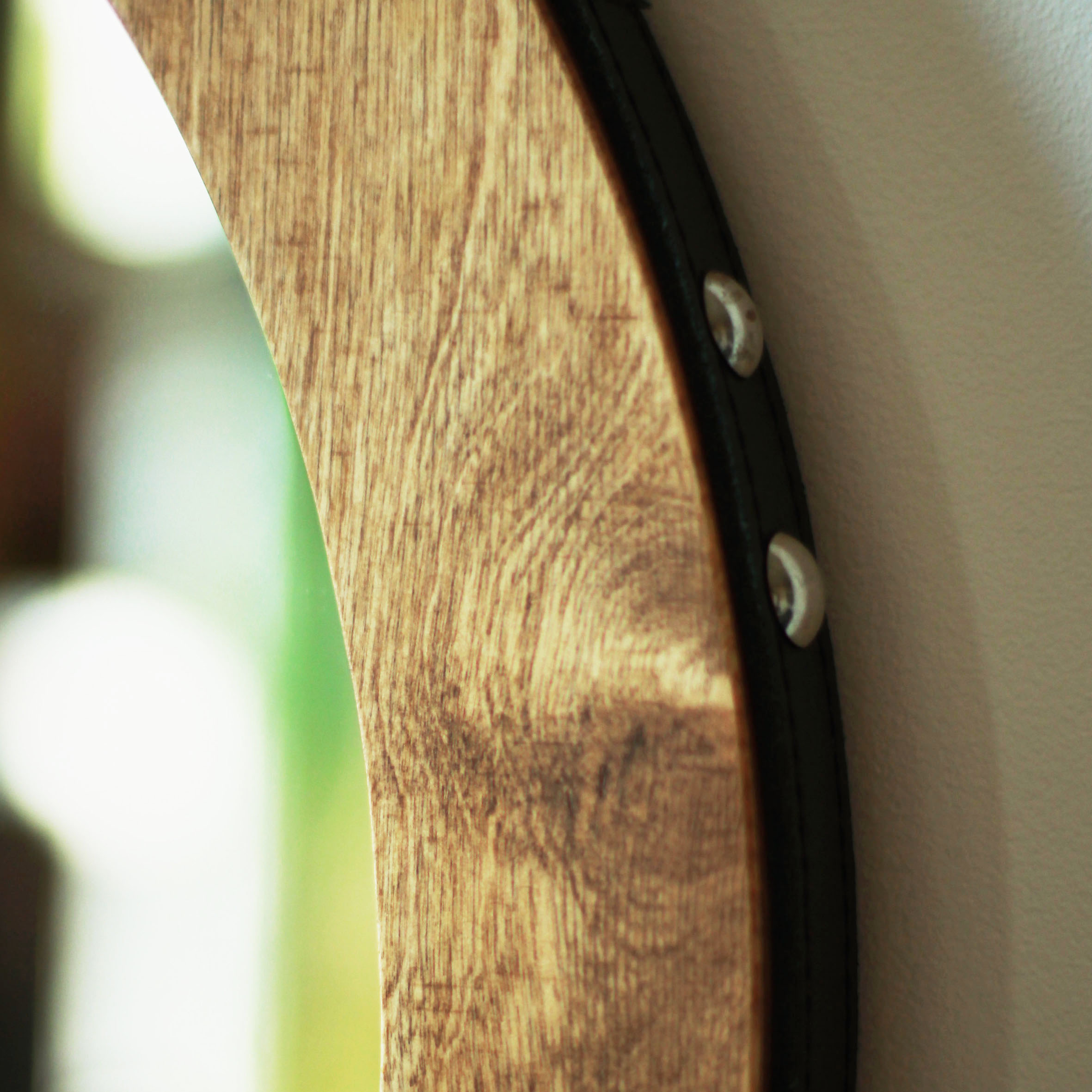 Lustro zawieszone jest na czarnym skórzanym pasku, który dodatkowo wzmocniony jest mocowaniem za pomocą dekoracyjnych gwoździ tapicerskich, zapewniając nie tylko trwałość, ale i wyjątkowy wygląd. W zestawie znajduje się także dekoracyjny kołek do zawieszenia, co ułatwia montaż.