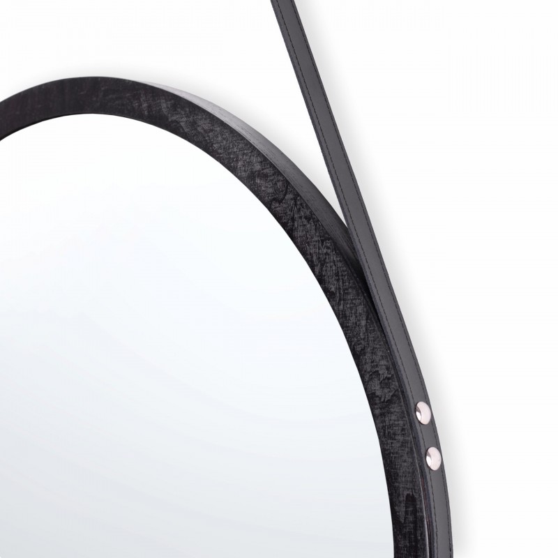 Całość ozdobiona jest czarnym skórzanym paskiem, który dodatkowo wzmacnia konstrukcję dzięki dekoracyjnym gwoździom tapicerskim. W zestawie znajduje się także elegancki kołek, który umożliwia zawieszenie lustra na ścianie.