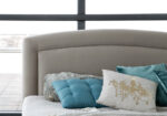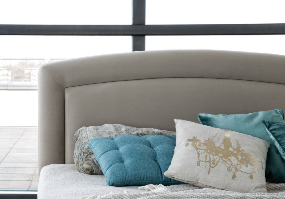 Zagłówek wycięty w delikatny łuk z wyraźnie zaznaczoną linią tapicerowania tworzy harmonijną, symetryczną ramę.