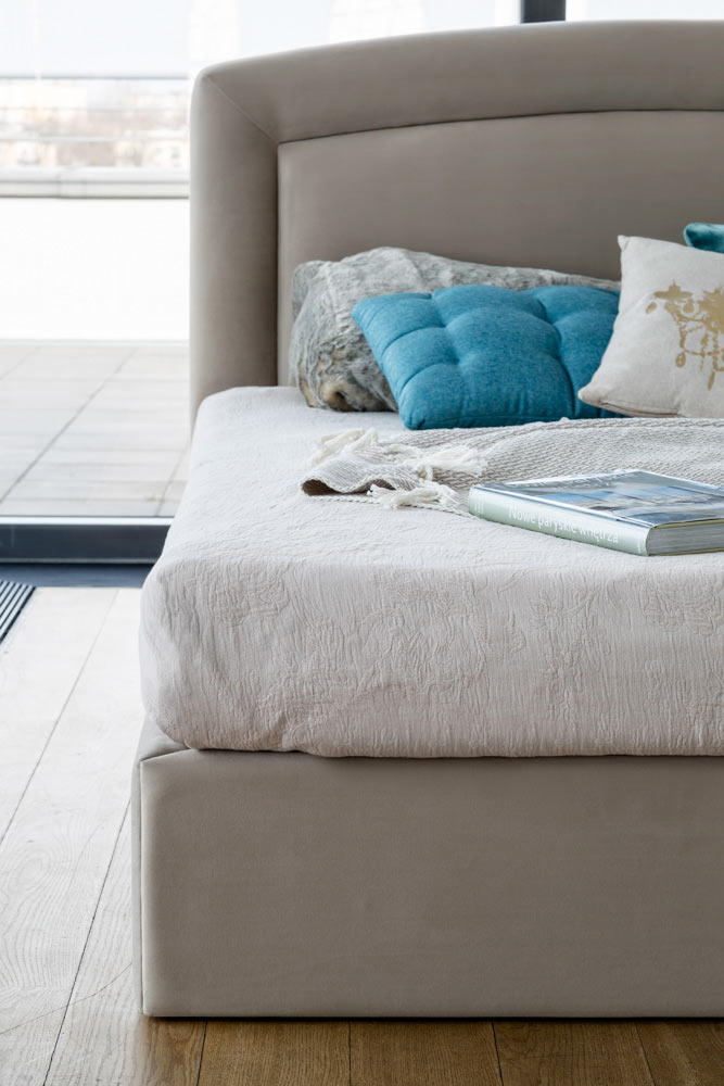Łóżko dostępne jest w szerokiej gamie tkanin oraz w kilku rozmiarach.