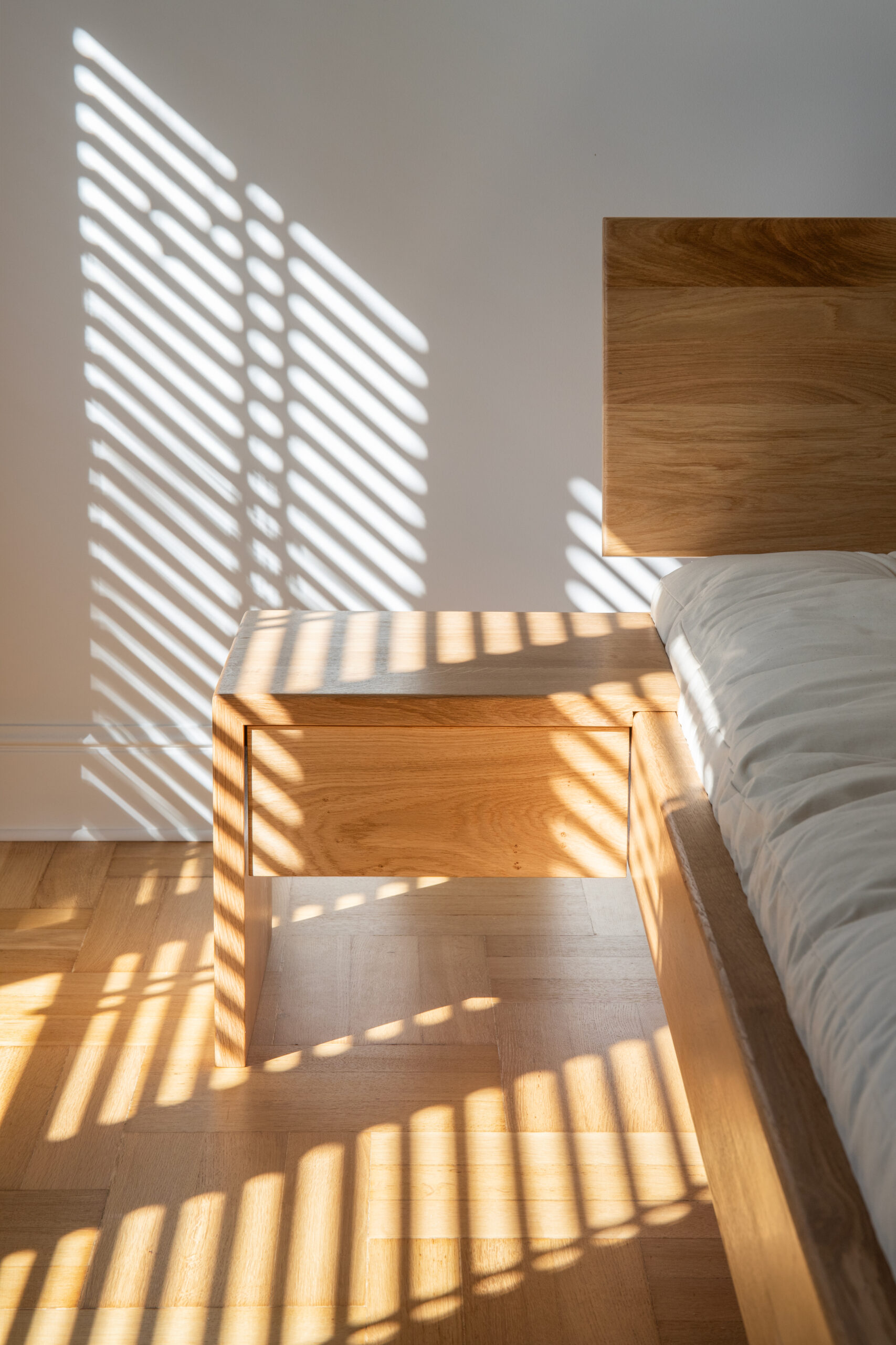 Prosta, niska bryła oraz szeroka rama nadają łóżku stabilności i wizualnej harmonii, a wyraźne usłojenie drewna dodaje mu ciepła i autentycznego charakteru. To propozycja dla osób, które cenią minimalizm, naturalne materiały i dopracowane detale.