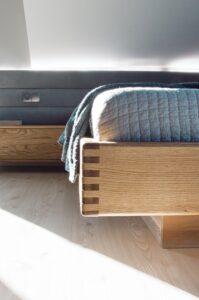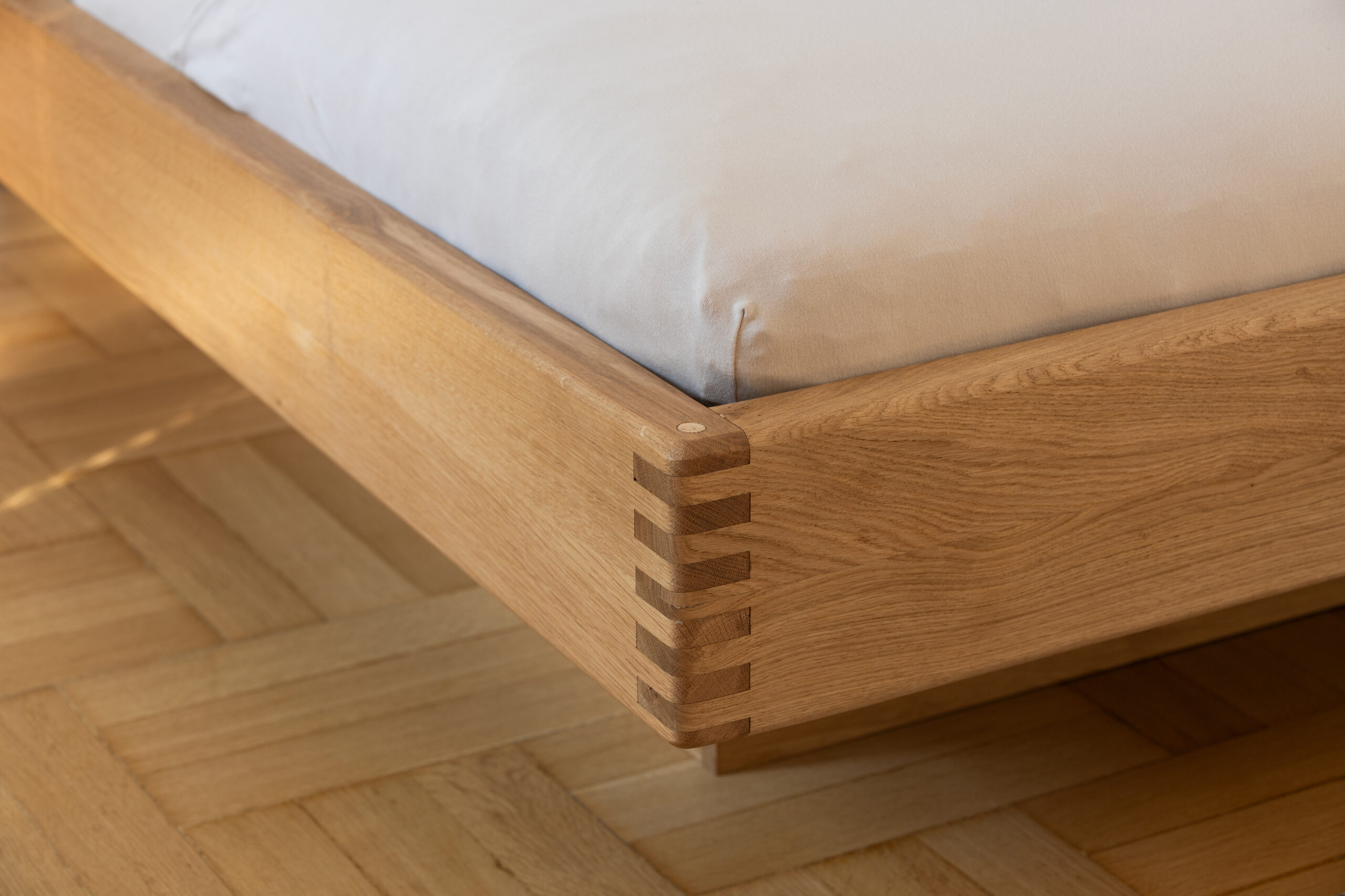 Łóżko MILANO z litego drewna o spokojnej, nowoczesnej formie, która podkreśla naturalne piękno materiału. Charakterystycznym elementem są starannie frezowane narożniki, łączone tradycyjną metodą i spinane drewnianym kołeczkiem – detal, który przyciąga uwagę i świadczy o wysokim kunszcie stolarskim.