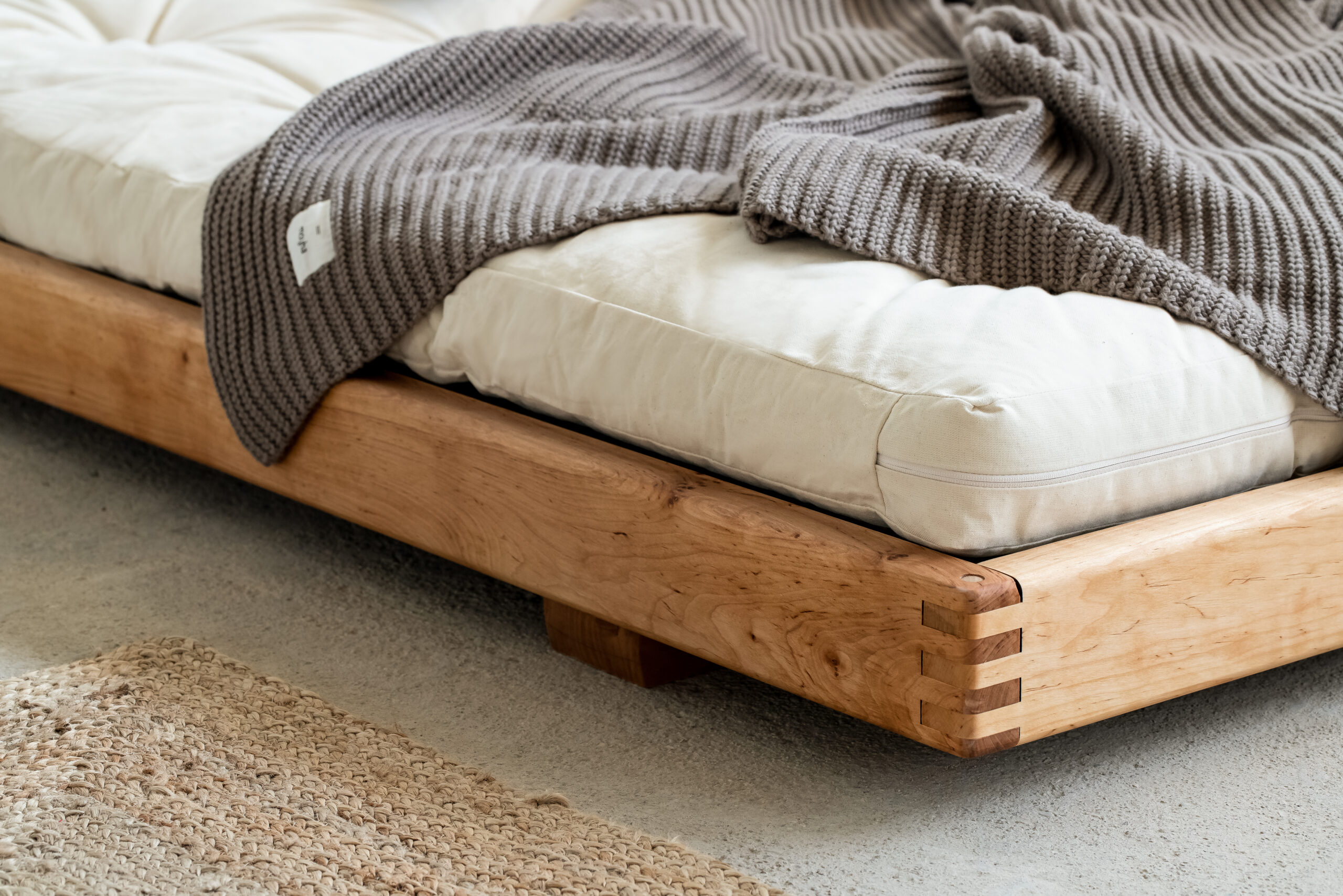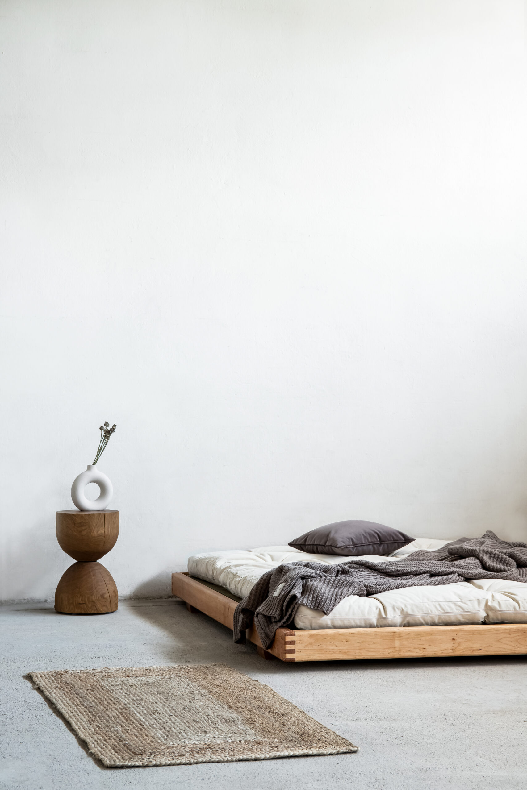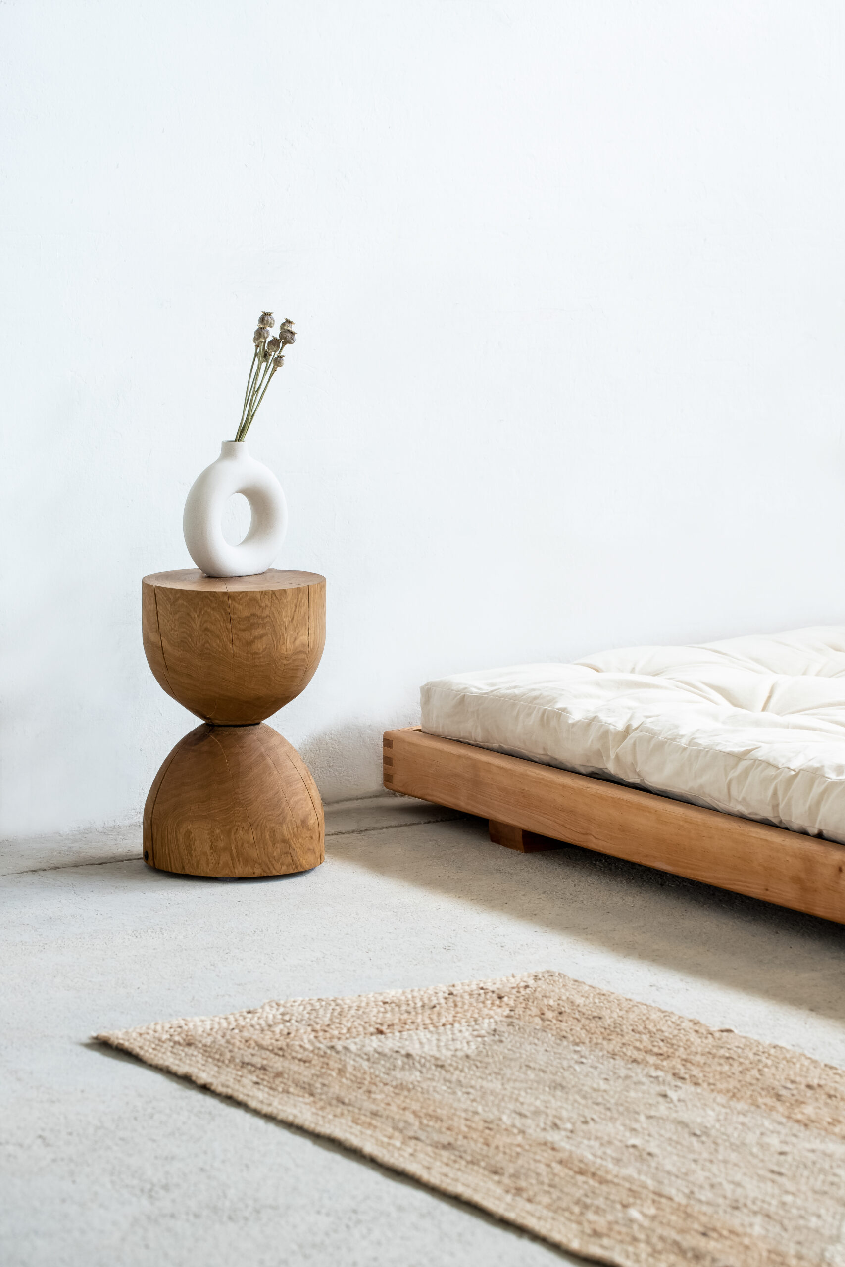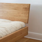 Uwagę przyciągają starannie wykonane narożniki z widocznym łączeniem drewna, które podkreślają rzemieślniczy charakter mebla. Szeroka, płaska rama stanowi stabilną podstawę dla materaca, eksponując jego formę i zachęcając do odpoczynku w duchu slow.