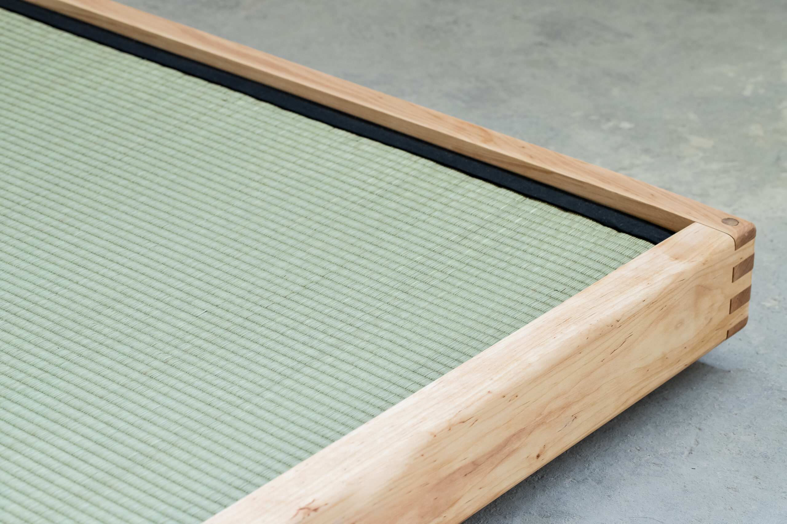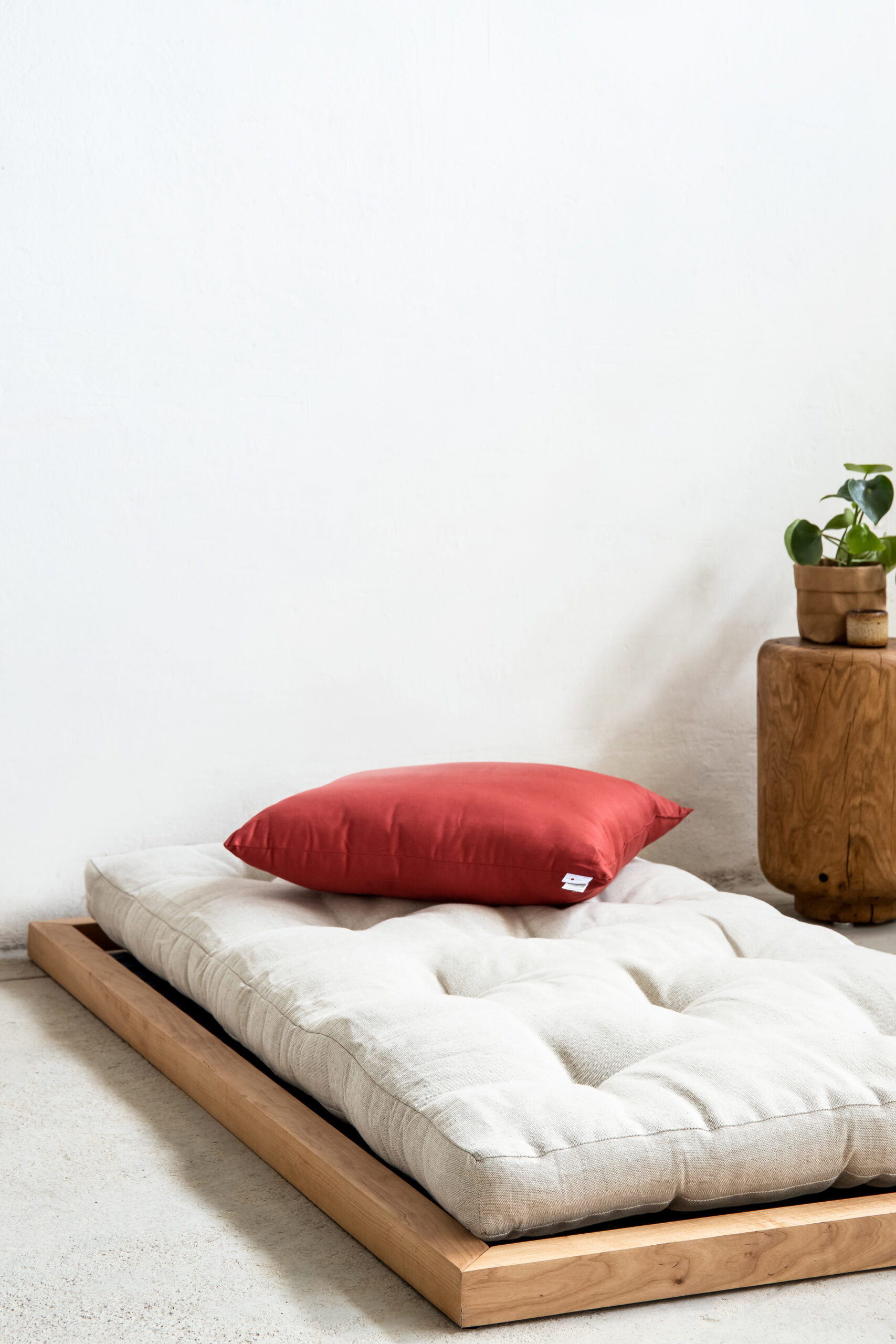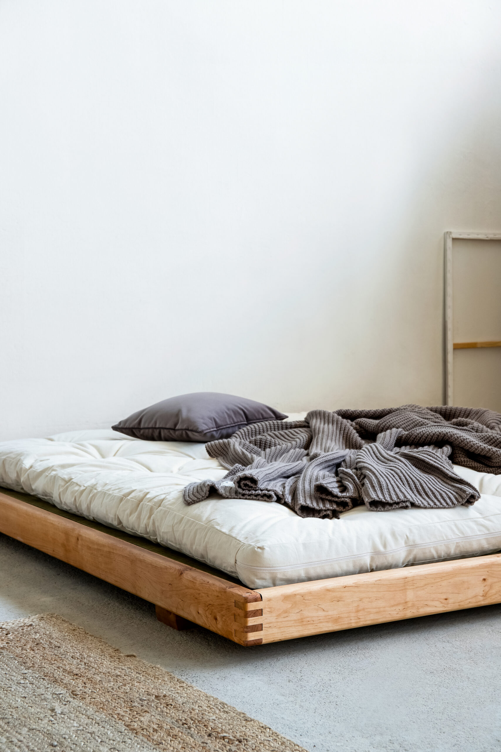 Uwagę przyciągają starannie wykonane narożniki z widocznym łączeniem drewna, które podkreślają rzemieślniczy charakter mebla. Szeroka, płaska rama stanowi stabilną podstawę dla materaca, eksponując jego formę i zachęcając do odpoczynku w duchu slow.
