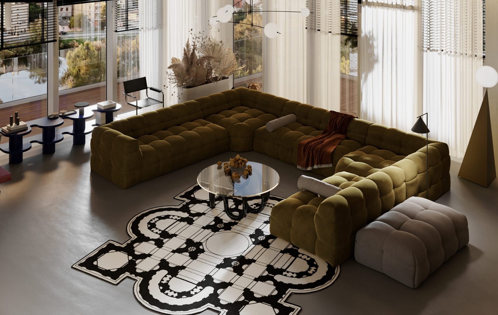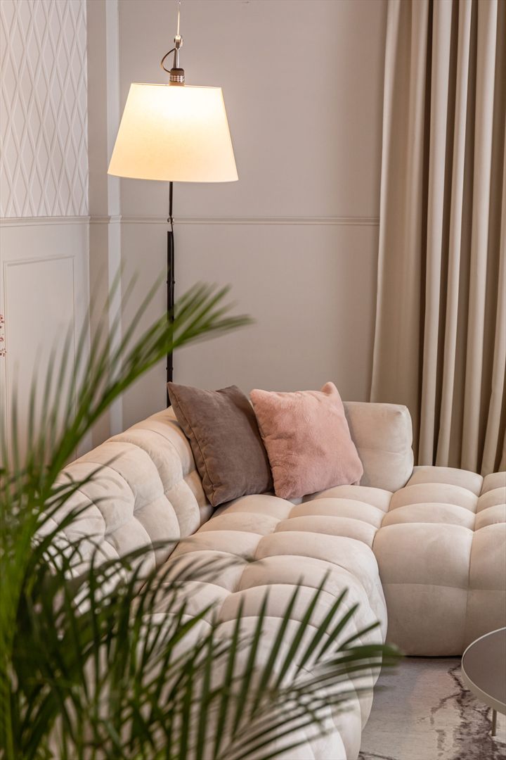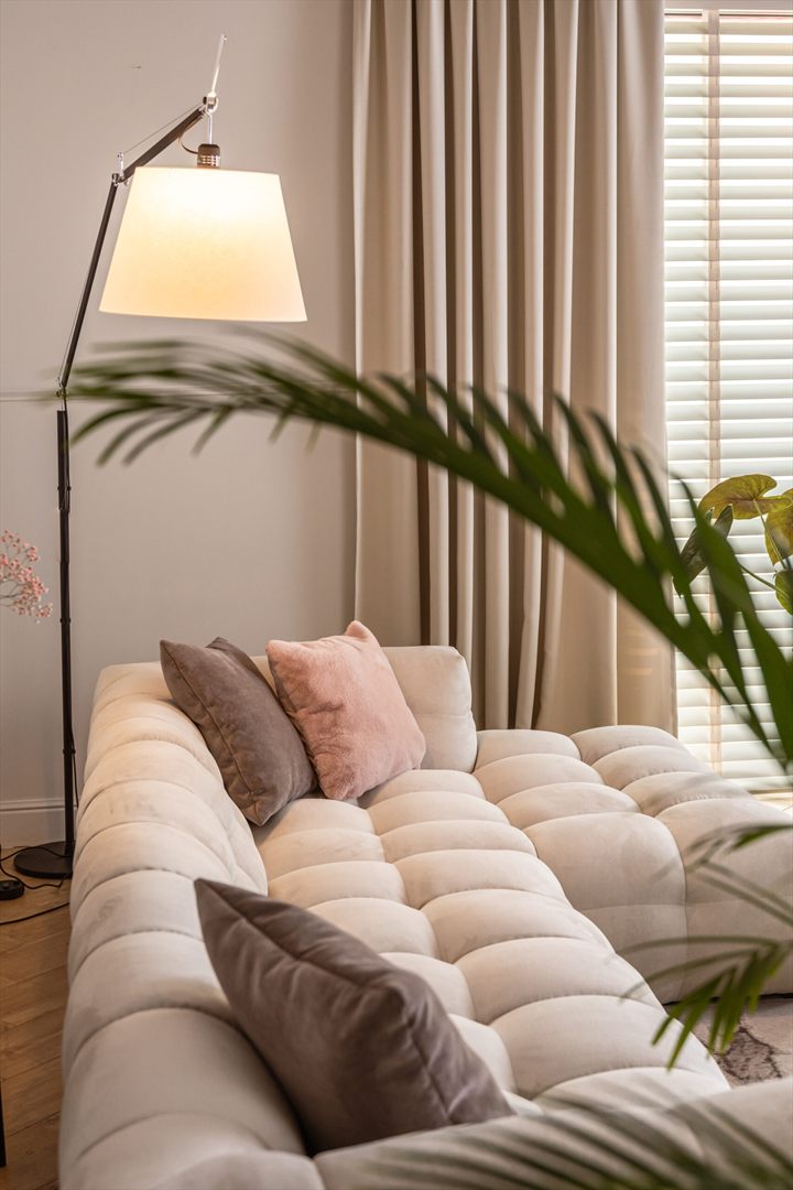 Jego oryginalna bryła, przypominająca obłok, oraz charakterystyczne przeszycia przyciągają wzrok i nadają pomieszczeniu unikalny charakter.