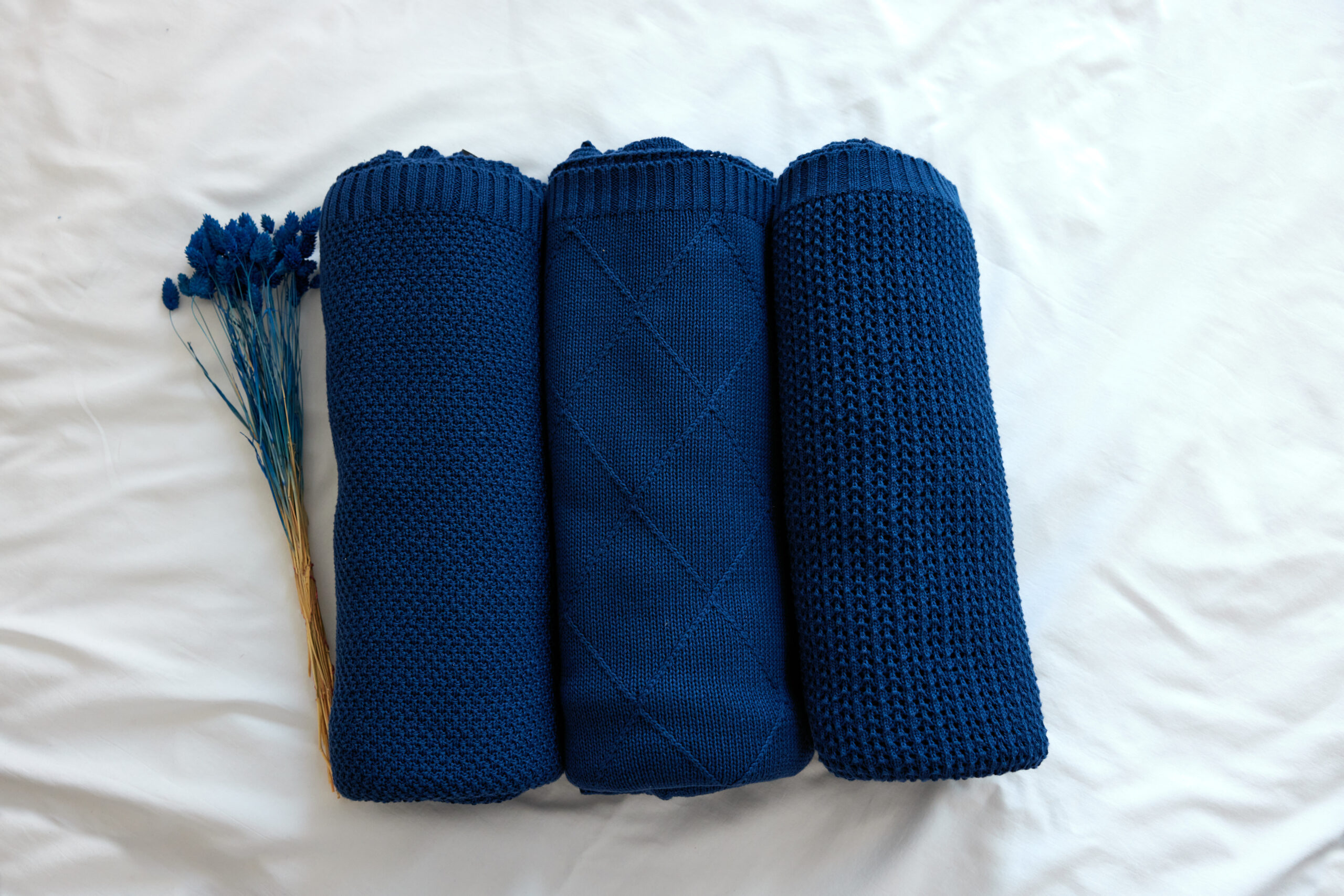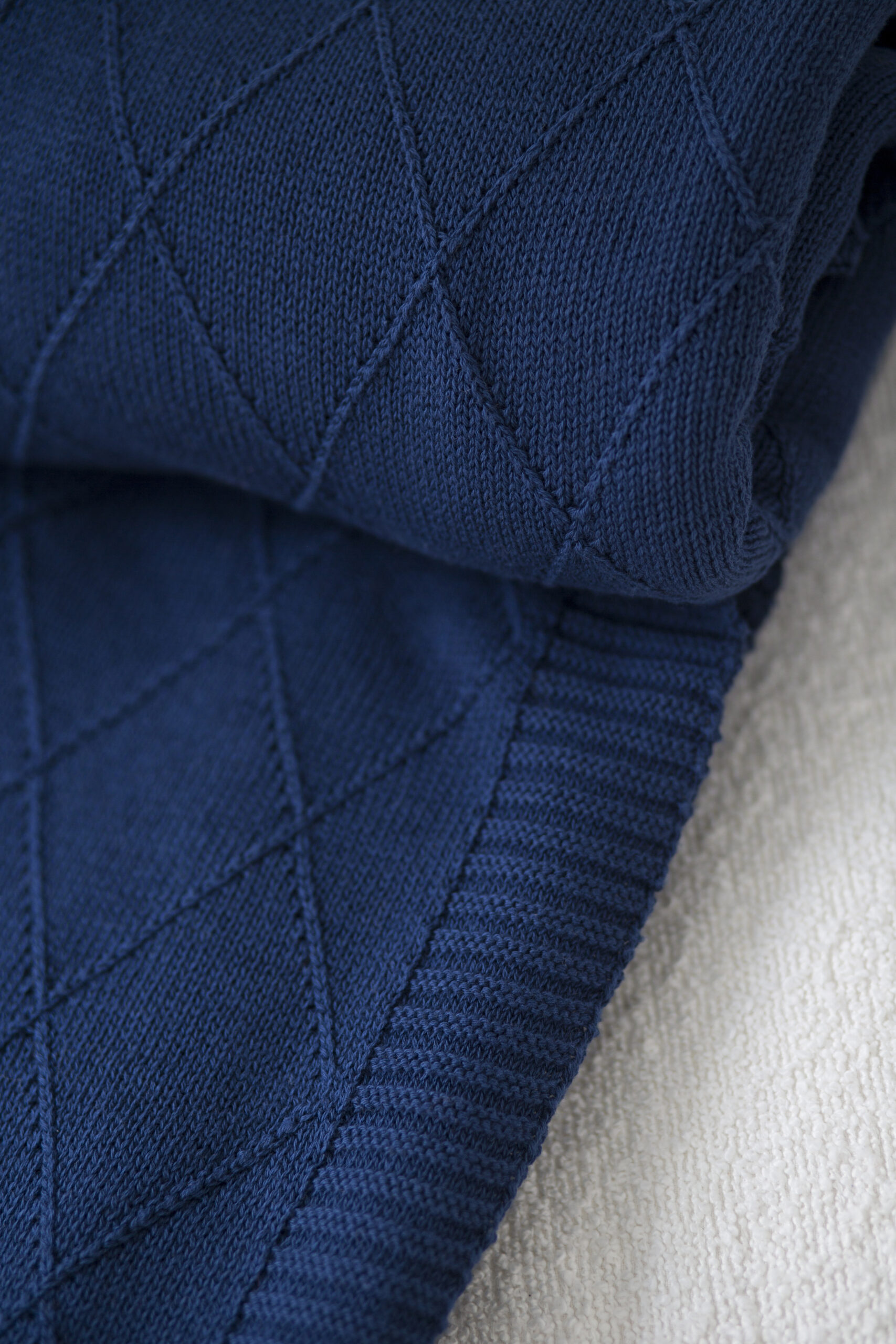 Ten elegancki pled w głębokim odcieniu granatu to idealne połączenie klasyki i nowoczesnego stylu. Jego ozdobny, regularny splot nadaje mu minimalistyczny i wyrafinowany wygląd, który doskonale komponuje się z jasnymi, neutralnymi wnętrzami. Wykonany z ekologicznej przędzy ECOTEC®, jest nie tylko przyjemny w dotyku, ale także przyjazny dla środowiska. Latem otula delikatnie, a w chłodniejsze dni zapewnia ciepło i komfort.