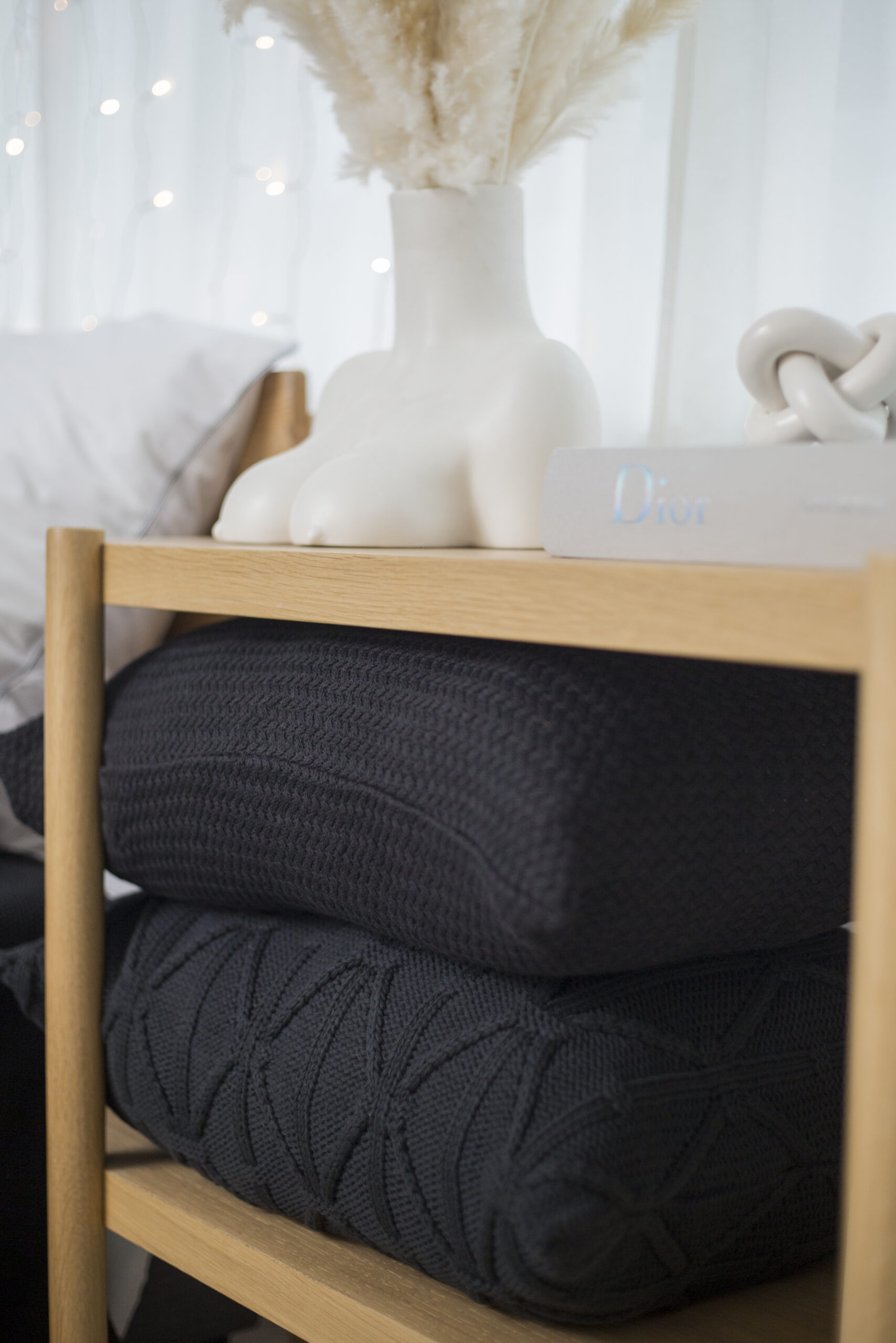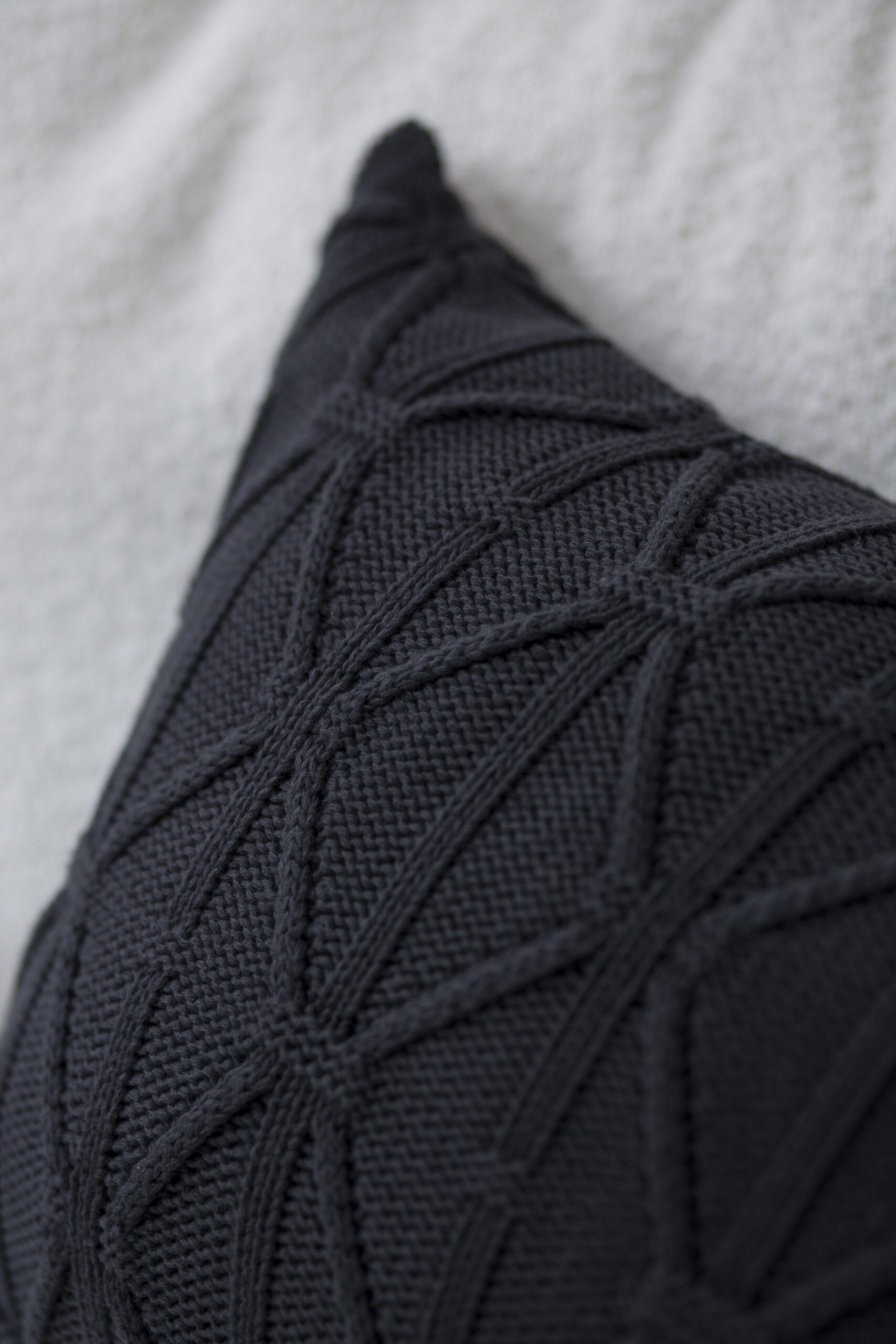Grafitowa poszewka świetnie komponuje się z nowoczesnymi aranżacjami, tworząc elegancką przestrzeń. Doskonale łączy się z drewnianymi elementami i roślinami, wprowadzając do pomieszczenia przytulność oraz klasyczny design.
