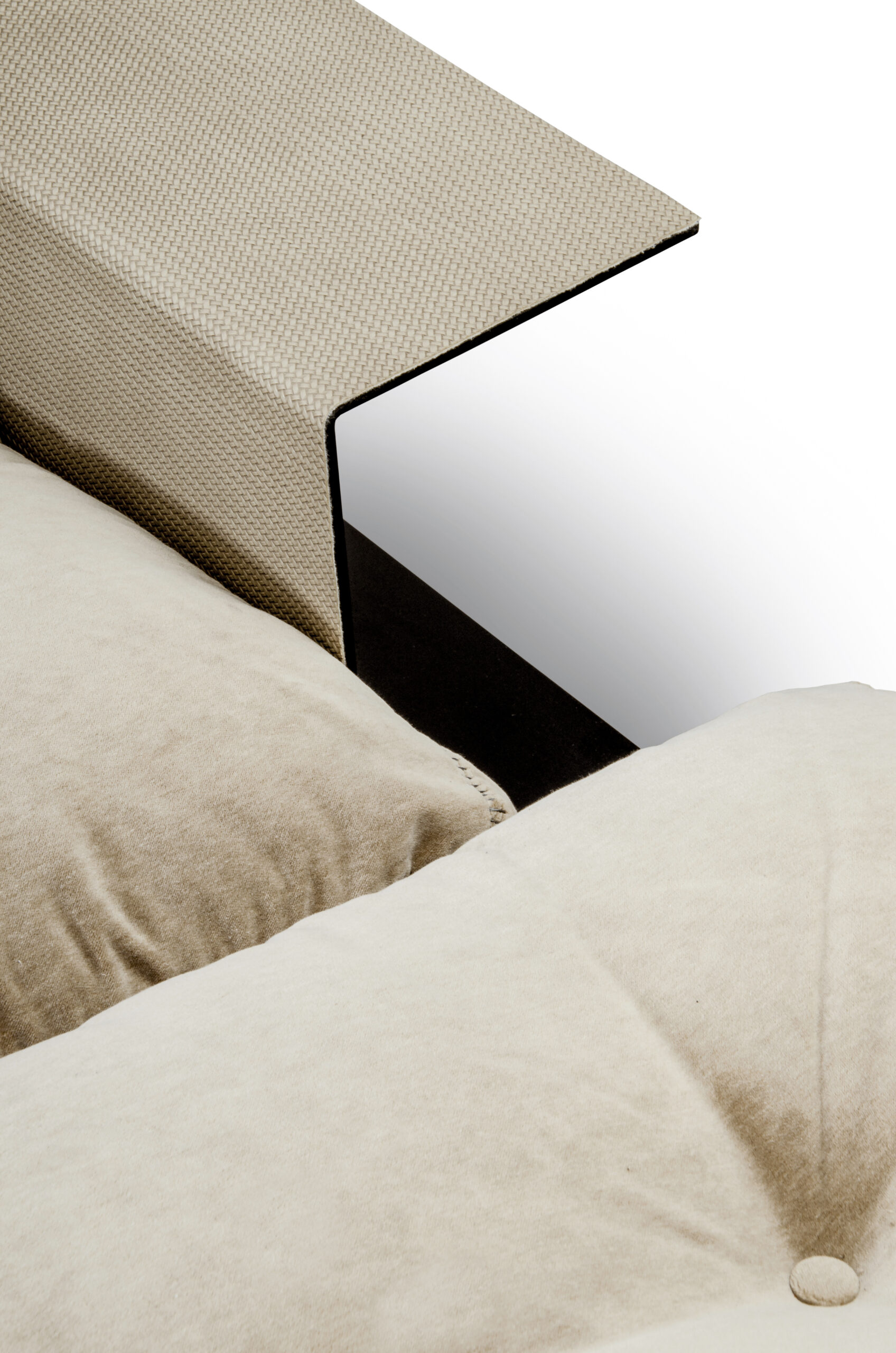 Eleganckie przeszycia szarą nicią dodają jej subtelnej klasy, a smukłe, metalowe nogi sprawiają, że bryła nabiera lekkości i łatwości w utrzymaniu czystości. Dodatkowo, sofa narożna Study wyposażona jest w metalowe półki – jedna pełni funkcję podłokietnika, a druga jest umieszczona z tyłu, oferując praktyczne miejsce do przechowywania różnych przedmiotów. Półki mogą być wykończone korkiem, gumą PVC lub skórą, w zależności od indywidualnych preferencji.