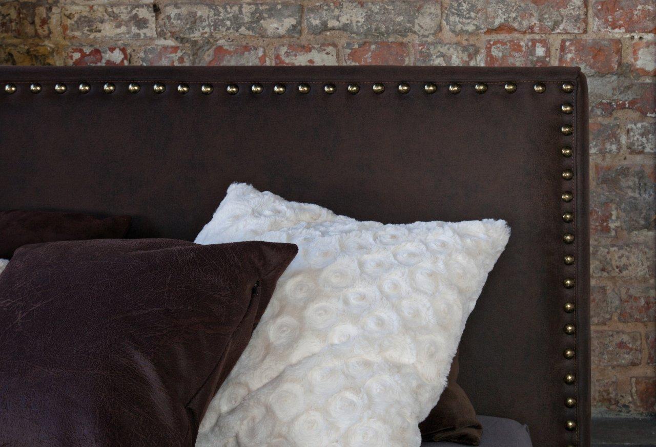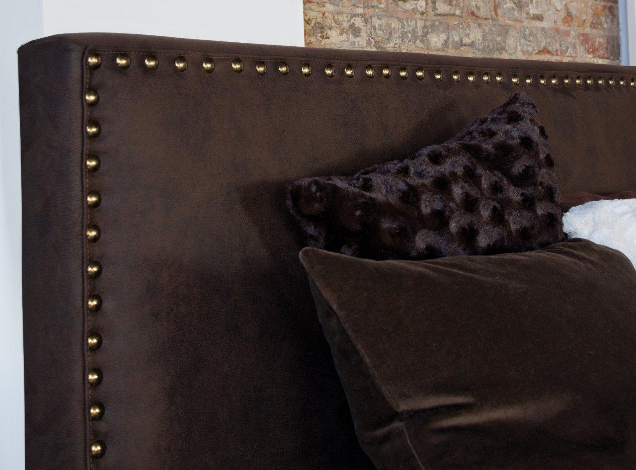 Zagłówek oraz zanóżek ozdobione ćwiekami tworzą spójną i wyrazistą kompozycję, która wyróżnia ten model na tle klasycznych łóżek.