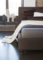 Łóżko dostępne jest w szerokiej gamie tkanin oraz daje możliwość personalizacji detali, w tym wyboru rodzaju ćwieków.
