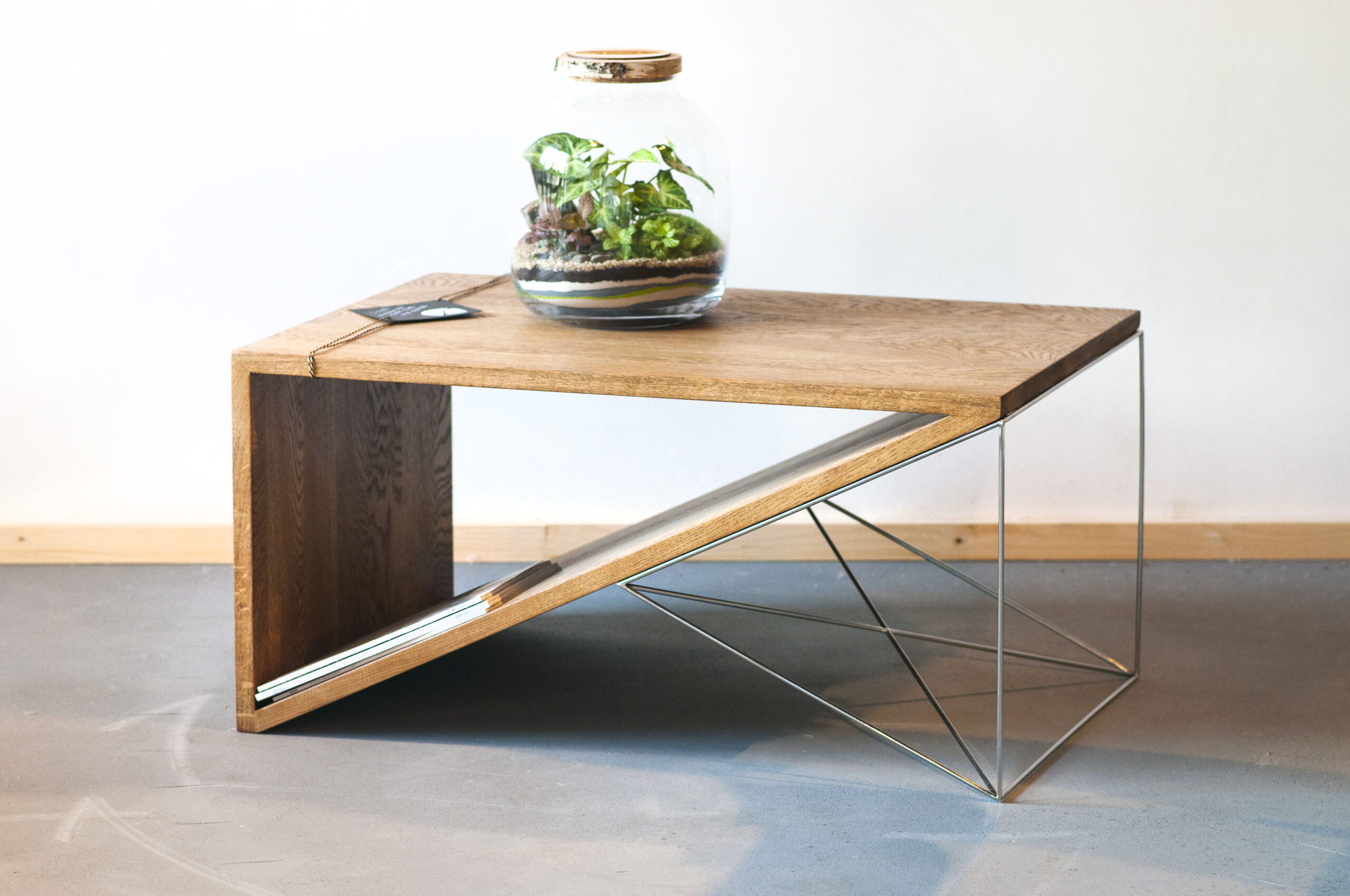 Unikatowy stolik z drewnianym blatem i metalową ramą
