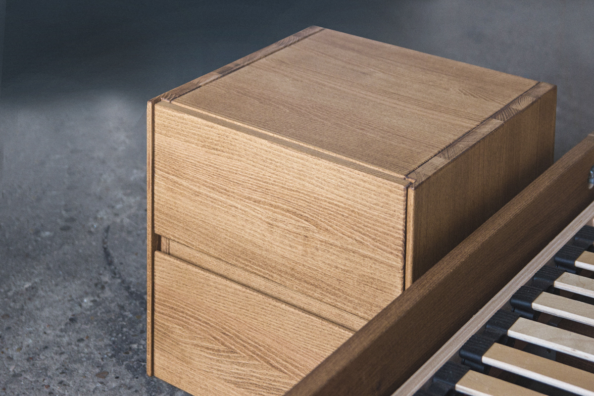 Model wyposażony jest w dwie pojemne szuflady, które pozwalają na wygodne przechowywanie podręcznych przedmiotów – książek, ładowarki, notatek czy innych drobiazgów. Szuflady otwierają się za pomocą eleganckich wnęk na palce, a za ich niezawodne działanie odpowiadają wysokiej klasy prowadnice firmy BLUM.