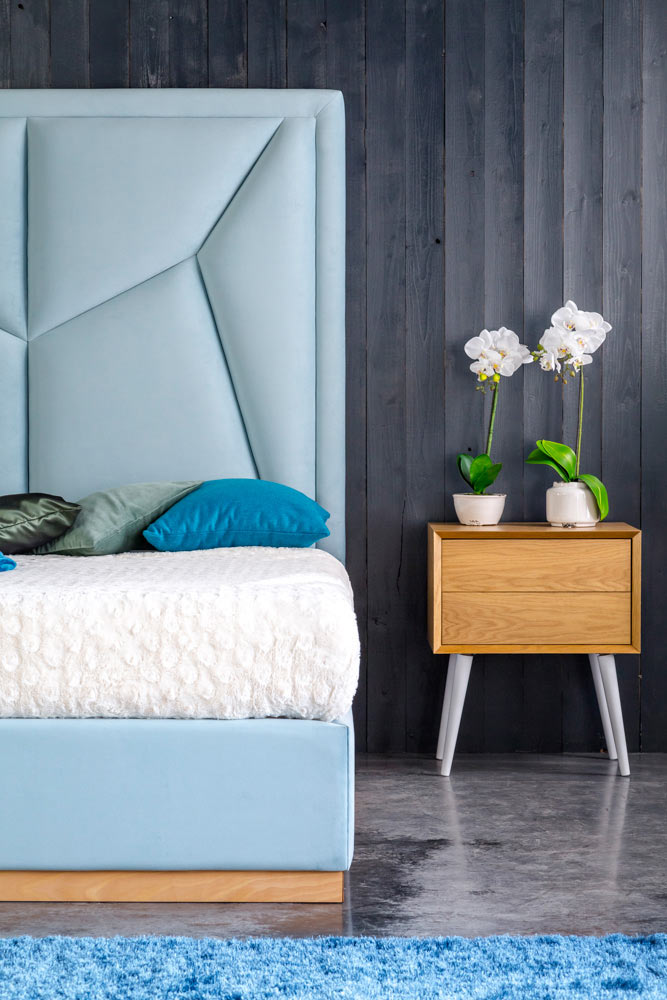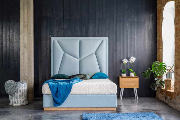 Najbardziej charakterystycznym elementem jest bardzo wysoki zagłówek (170 cm) o graficznym, asymetrycznym tapicerowaniu, które nadaje całości dynamicznego i nowoczesnego charakteru.