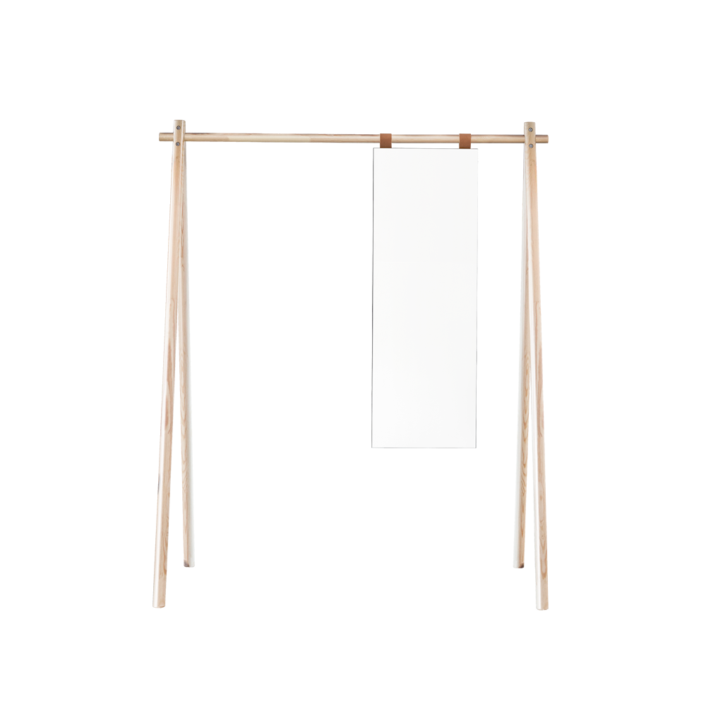 Minimalistyczny wieszak na ubrania z drewna sosnowego. Dostępny w dwóch rozmiarach, w wersji z lustrem lub bez.