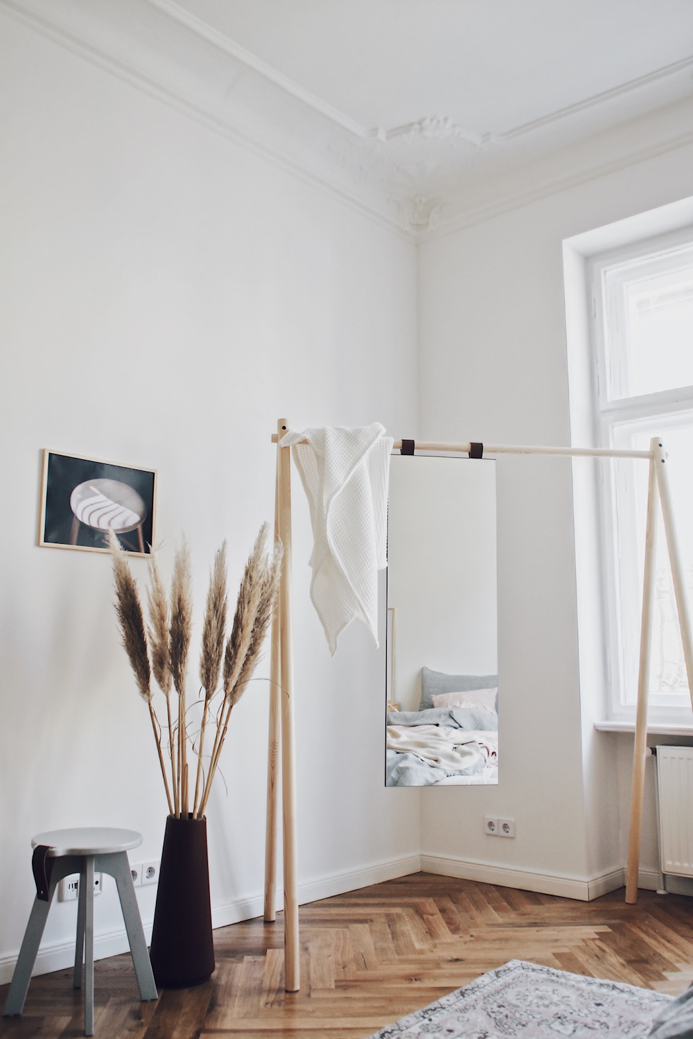 Drewniany mobilny wieszak na ubrania z lustrem.