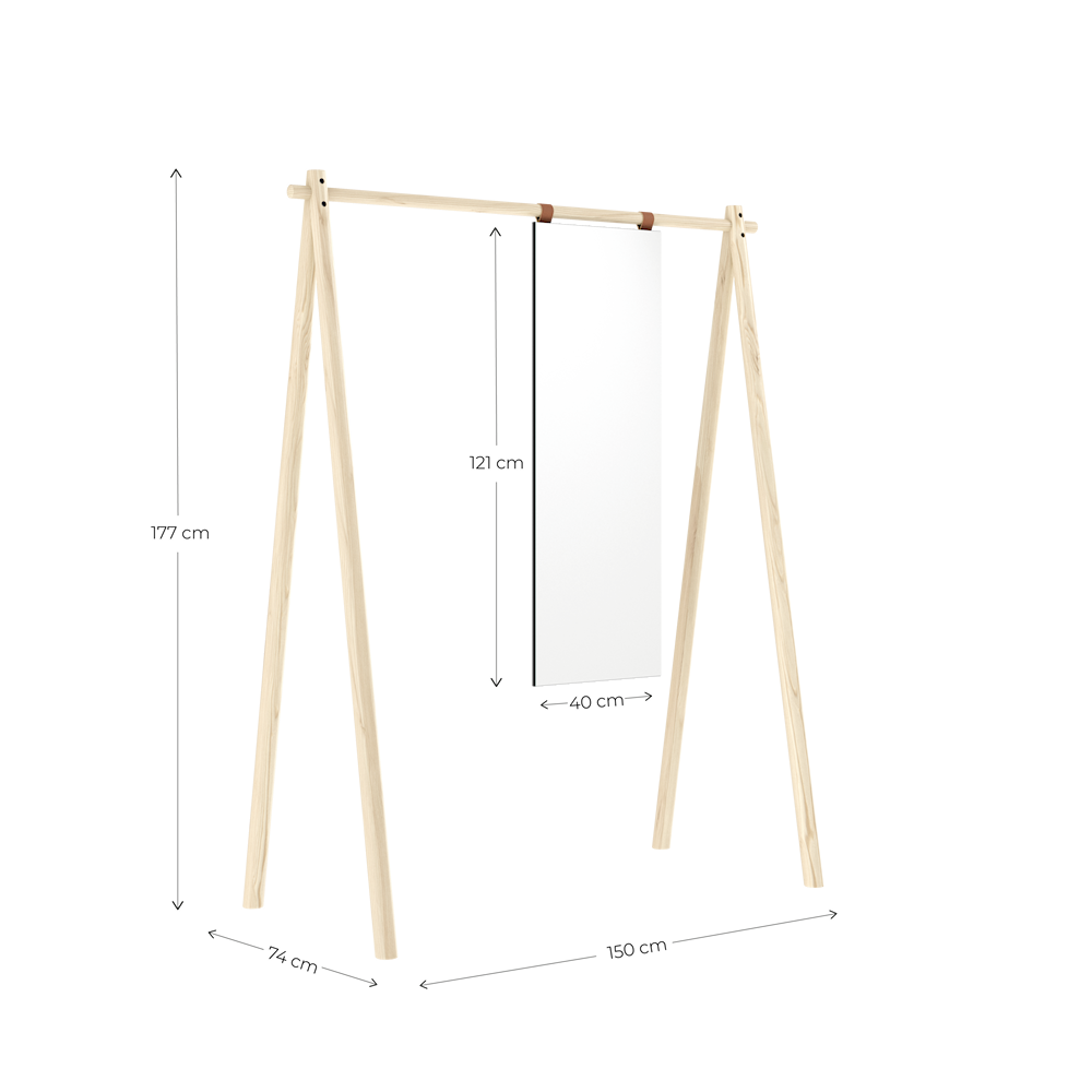 Minimalistyczny wieszak na ubrania z drewna sosnowego. Dostępny w dwóch rozmiarach, w wersji z lustrem lub bez.