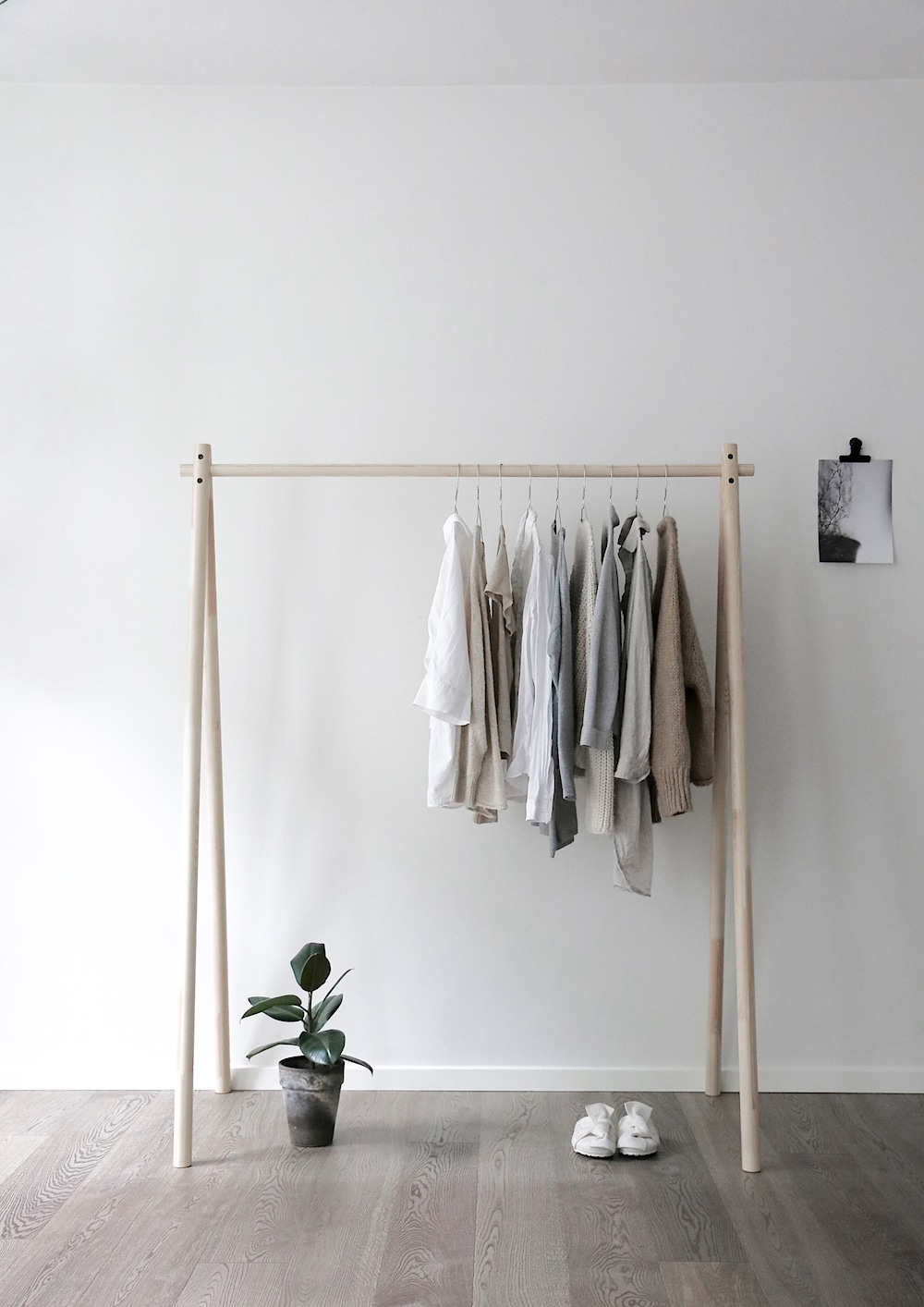 Minimalistyczny wieszak na ubrania z drewna sosnowego. Dostępny w dwóch rozmiarach, w wersji z lustrem lub bez.