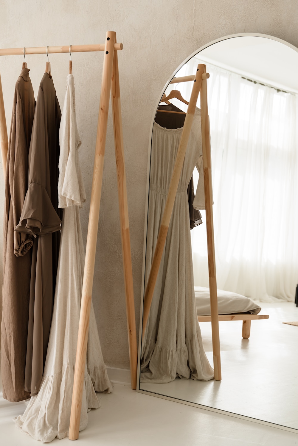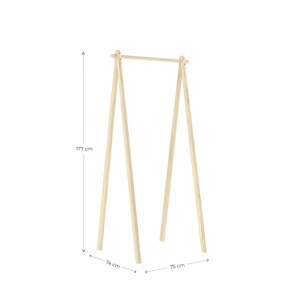 Minimalistyczny wieszak na ubrania z drewna sosnowego. Dostępny w dwóch rozmiarach, w wersji z lustrem lub bez.