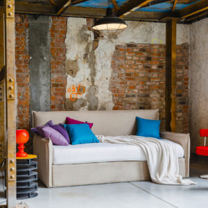 Jednoosobowe łóżko tapicerowane z podłokientnikami i pojemnikiem DIVANO 100×200